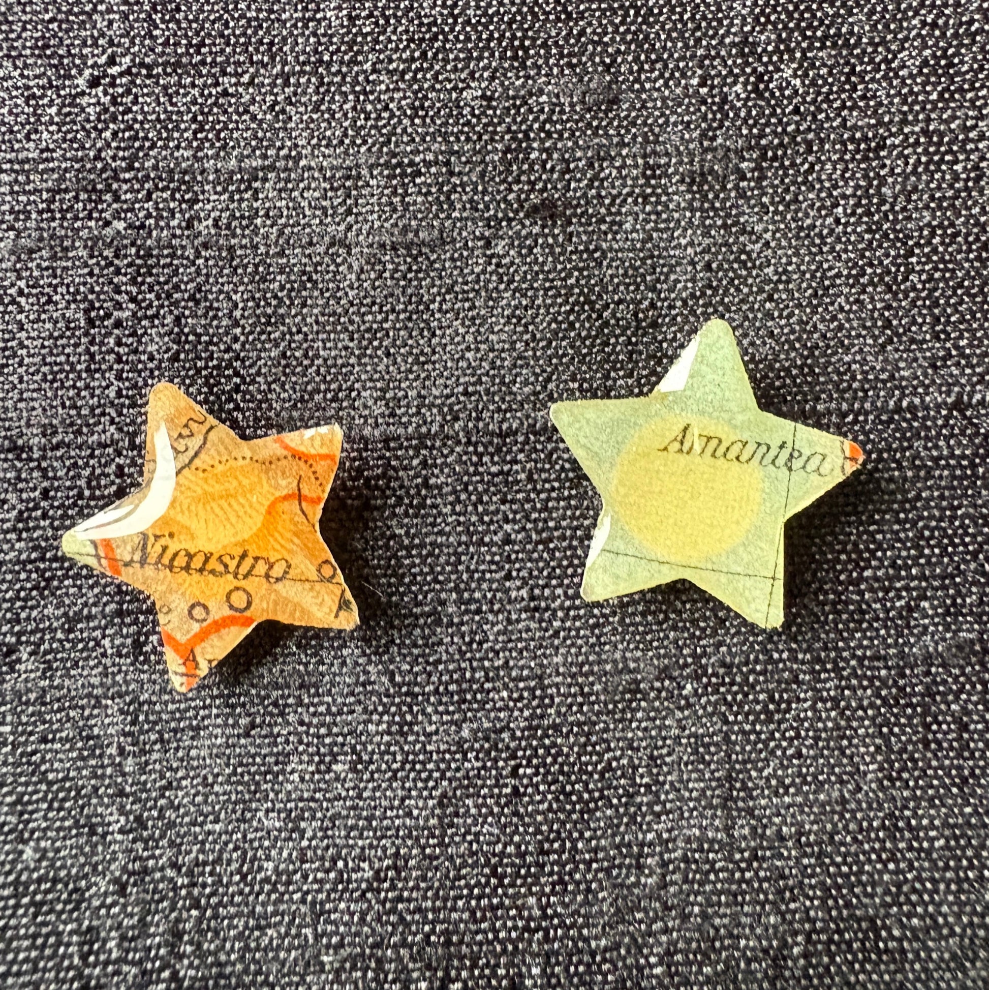 These screw earrings feature a star-shaped design incorporating cartographic details from a 1932 edition of the geography of Nicastro and Amantea. Crafted from resin, they combine lightness with a simple, narrative aesthetic. Each piece is unique in its visual composition. Their delicate nature requires protection from moisture to preserve the material's integrity over time.