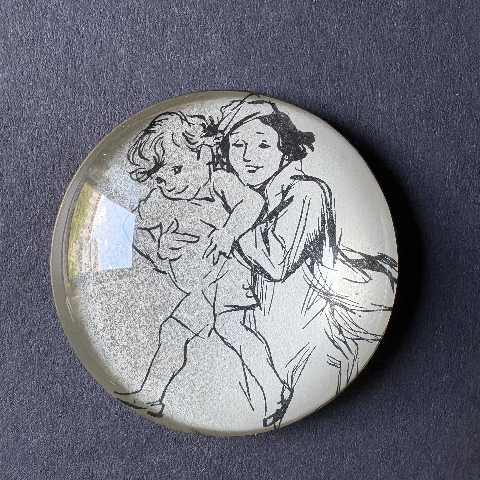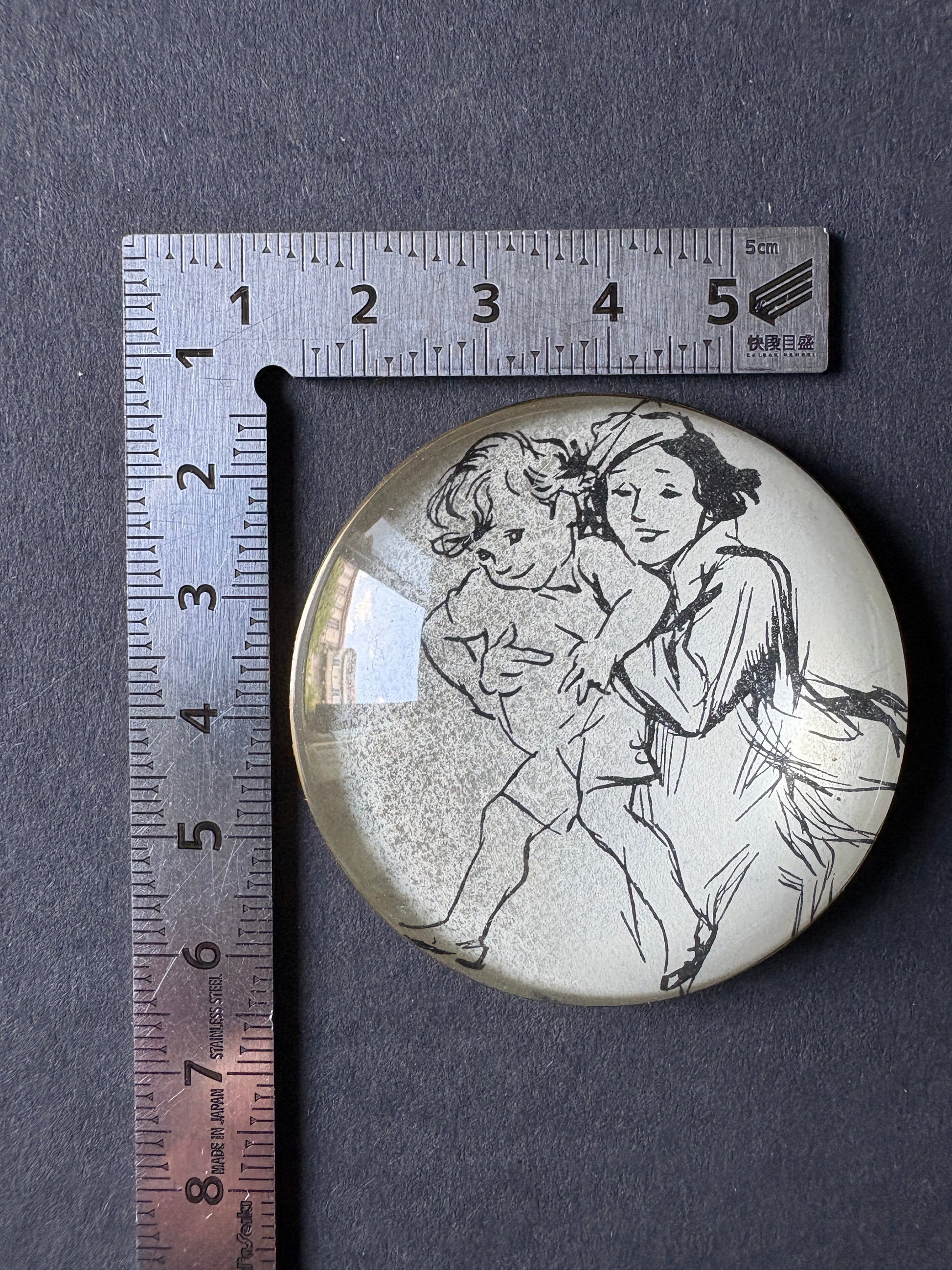 A mother's hug is the protagonist of this wink with an original image from 1960, illustrated by Blam, kept in a 5cm diameter glass lens and protected, on the background, by black velvet.