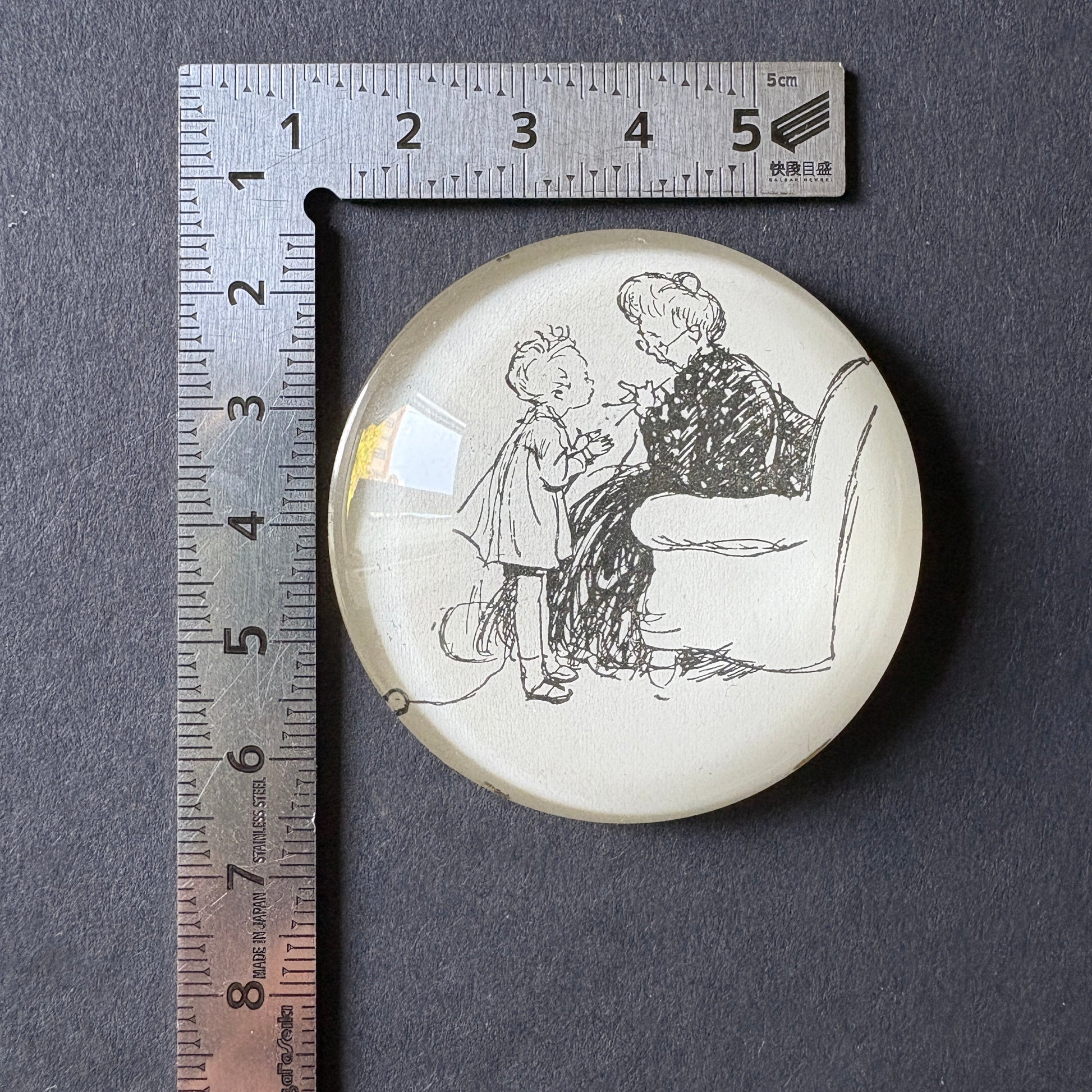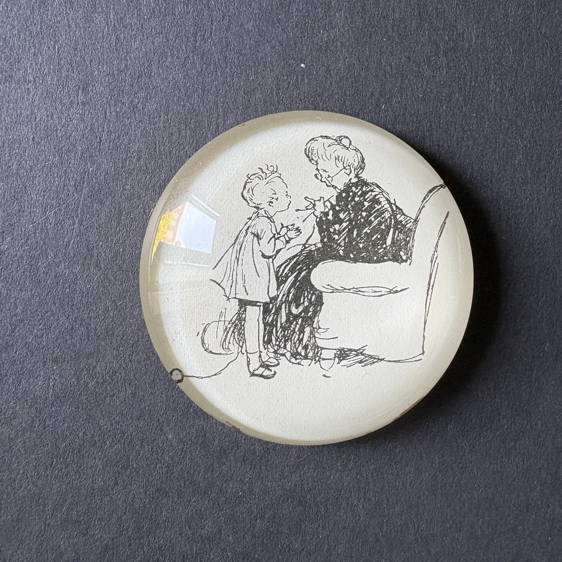 A wink that preserves the intimacy of a timeless moment across generations. It contains an original 1960 Blam clipping, a delicate illustration that captures the tenderness of a child with his grandmother. Mounted in a 5 cm diameter glass lens, protected by a black velvet base, it makes an extraordinary gift for anyone wishing to treasure a timeless emotion. Easy care: clean with a soft cloth, avoiding water.