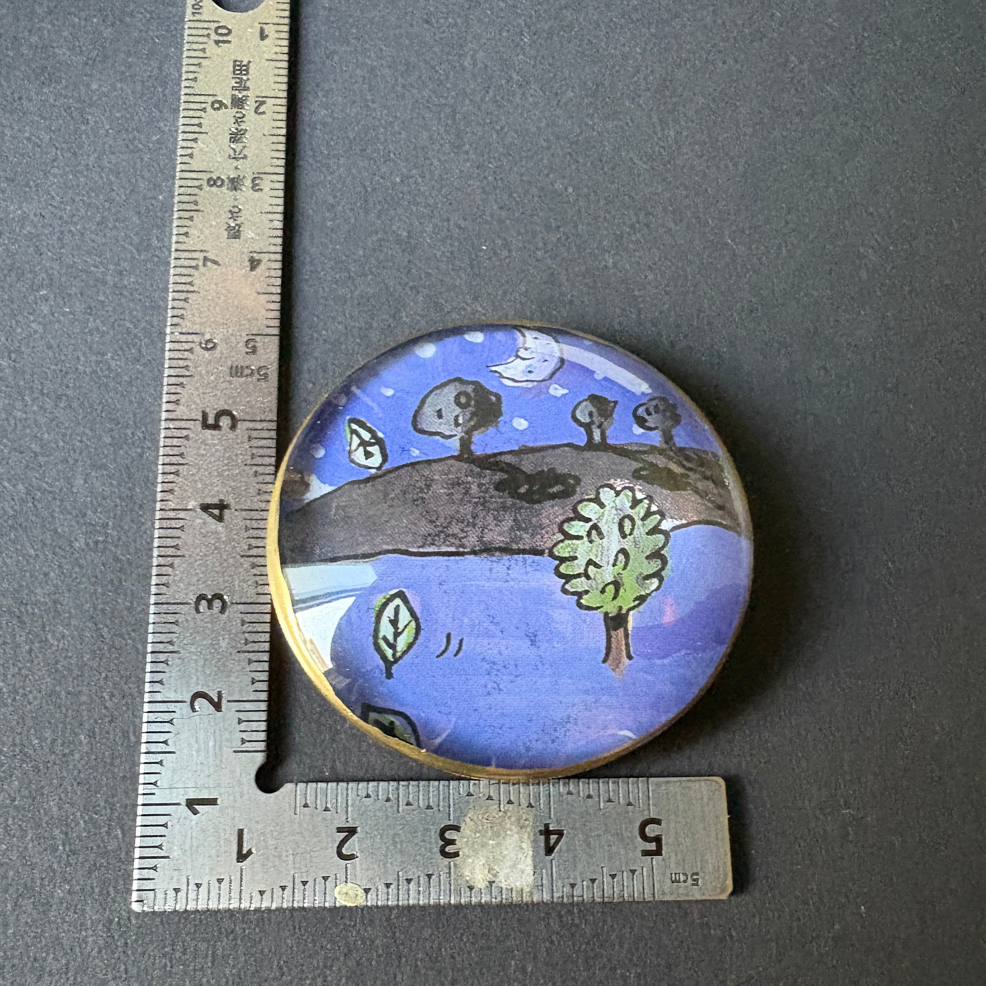 Discover an enchanted universe in just 5 centimeters! This charming wink features an extraordinary nighttime forest, a vintage illustration from a 2000 children's book by Ailie Busby. Behind the glass lens lies a miniature work of art, where every detail and color hue transports you to a magical, forgotten world. The soft black velvet-wrapped base adds a touch of sophisticated elegance, perfect for carrying on your travels, keeping on your desk, or giving as a gift to someone who loves small wonders.