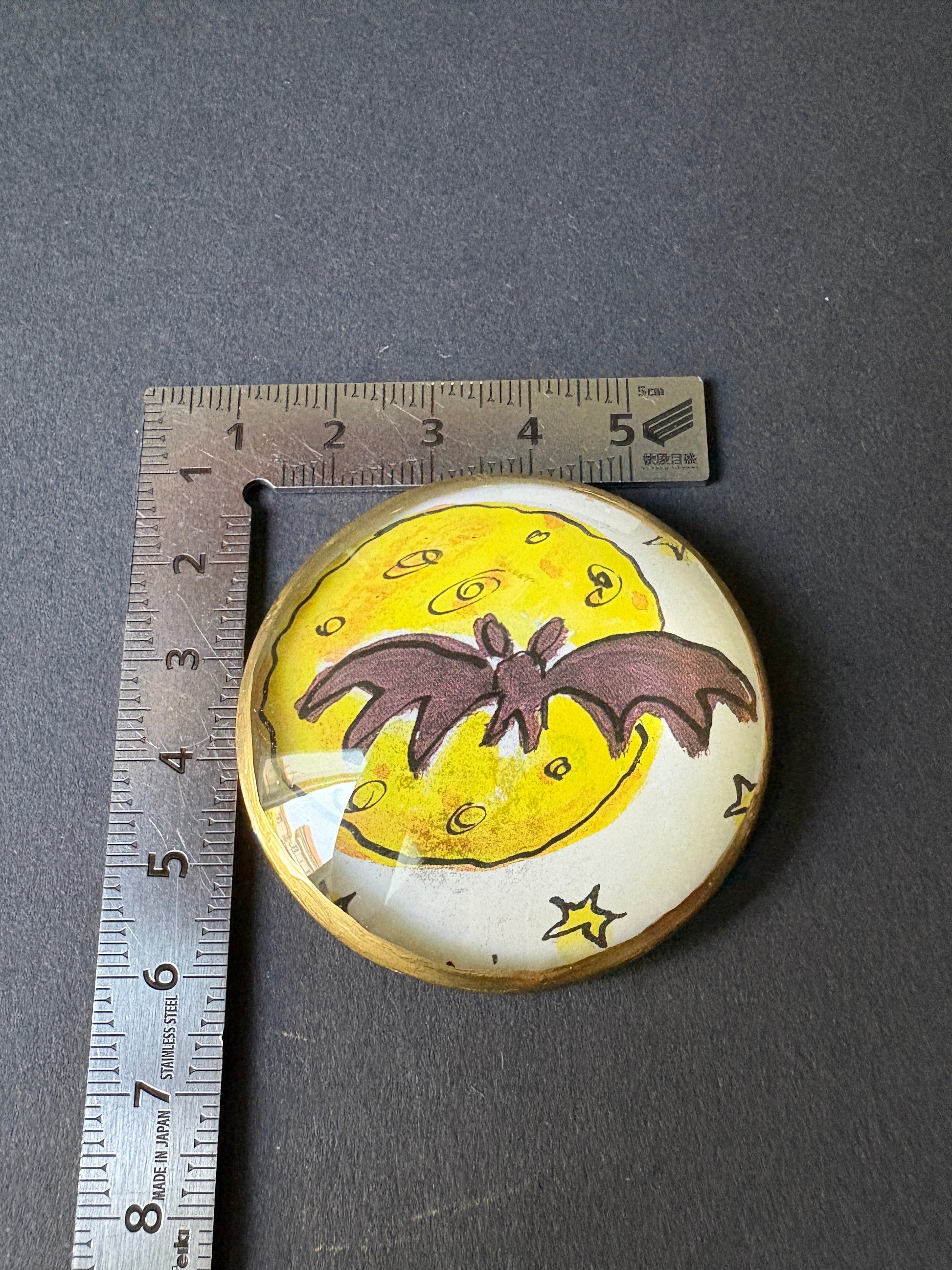 Bats deserve a second chance! These charming little creatures are impeccably clean, sworn enemies of mosquitoes, and completely harmless to your hair. Why not celebrate their beauty with this delightful wink? It features an original illustration by Ailie Busby behind a crisp glass lens, while the black velvet base feels irresistibly soft. Perfect for displaying on your desk, carrying around on your travels, or keeping close by for a touch of natural magic.