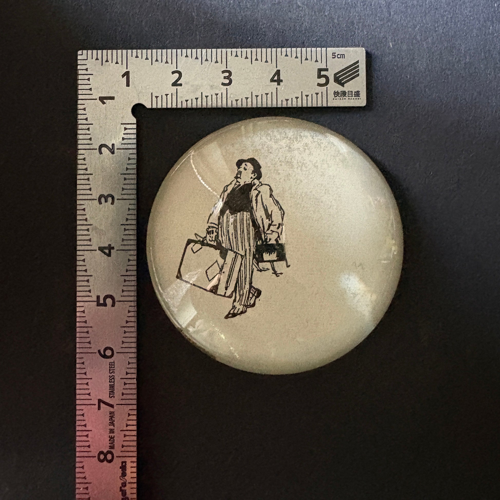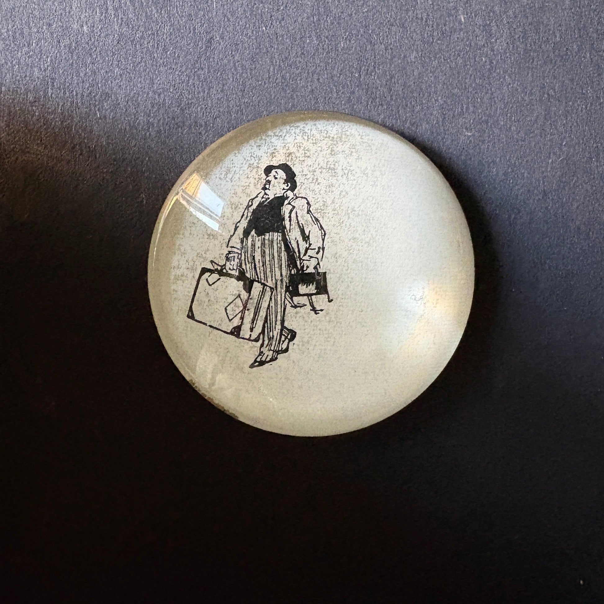 A fascinating piece of history that captures the elegance of travel from times gone by. This wink features an original 1960 illustration depicting a London gentleman with his suitcases, a tribute to the art of traveling in style. Encased in a 5cm glass lens and protected by black velvet, it becomes a discreet companion for those who appreciate adventure and nostalgia. Perfect for those who appreciate the charm of detail and the beauty of bygone eras. Store with care, wipe gently with a dry cloth.
