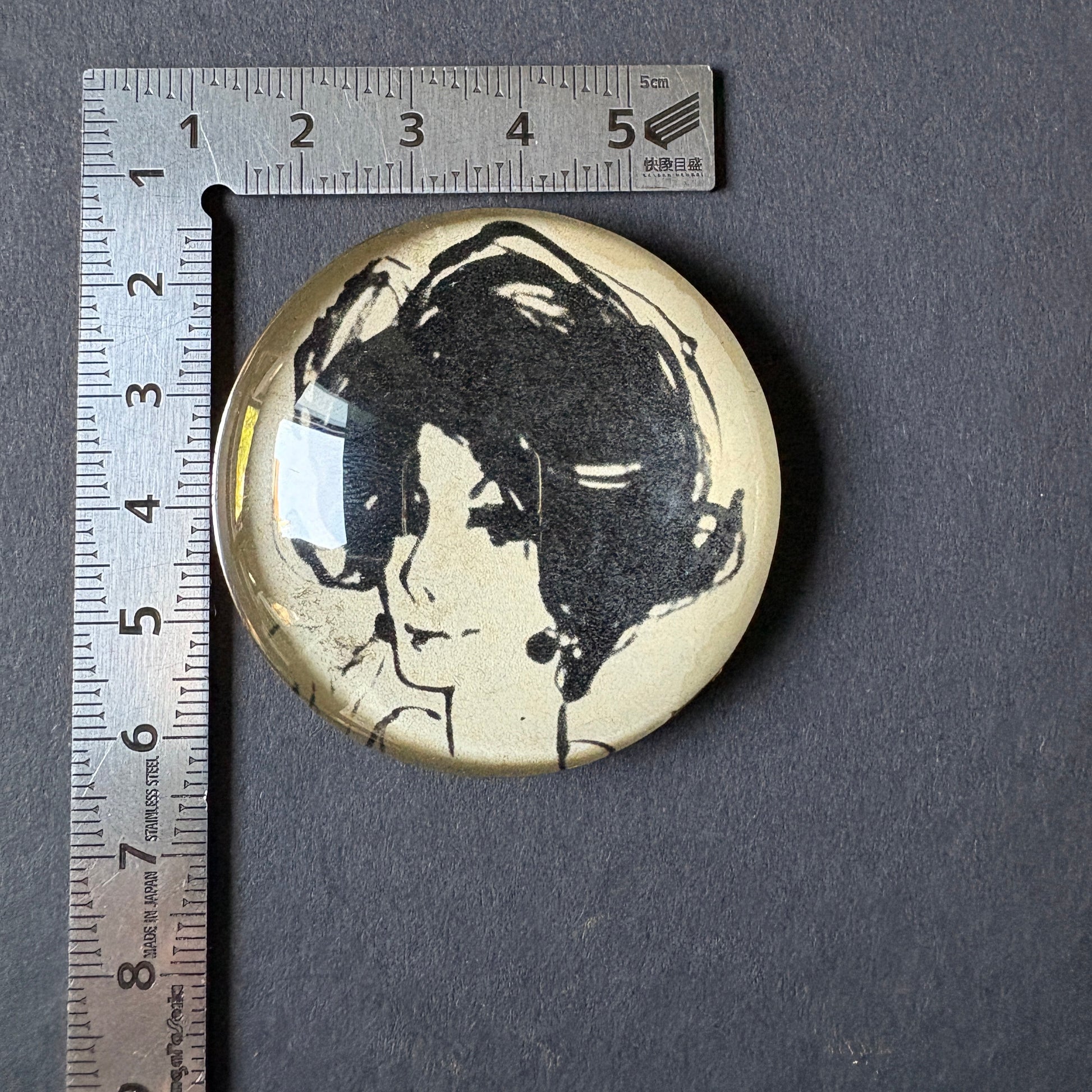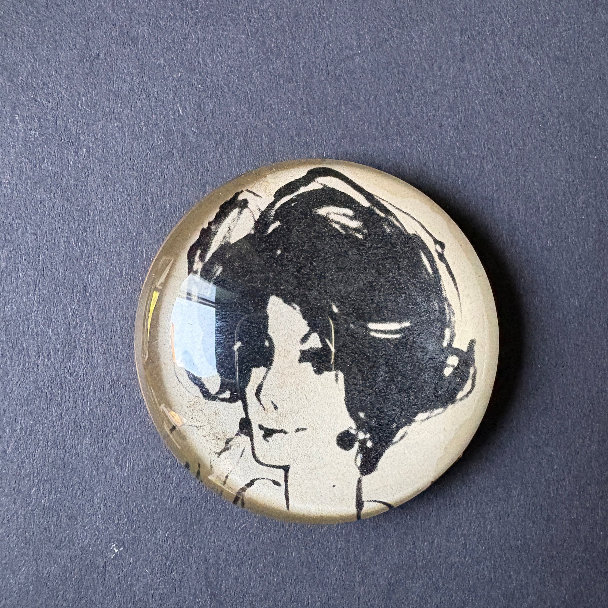 This wink captures an original vintage image from 1965, embodying an authentic segment of the fashion and style narrative. With a 5 cm diameter and a black velvet base, it's a distinctive accessory. Maintenance simply requires a gentle cloth; avoid exposure to moisture to preserve its integrity over time.