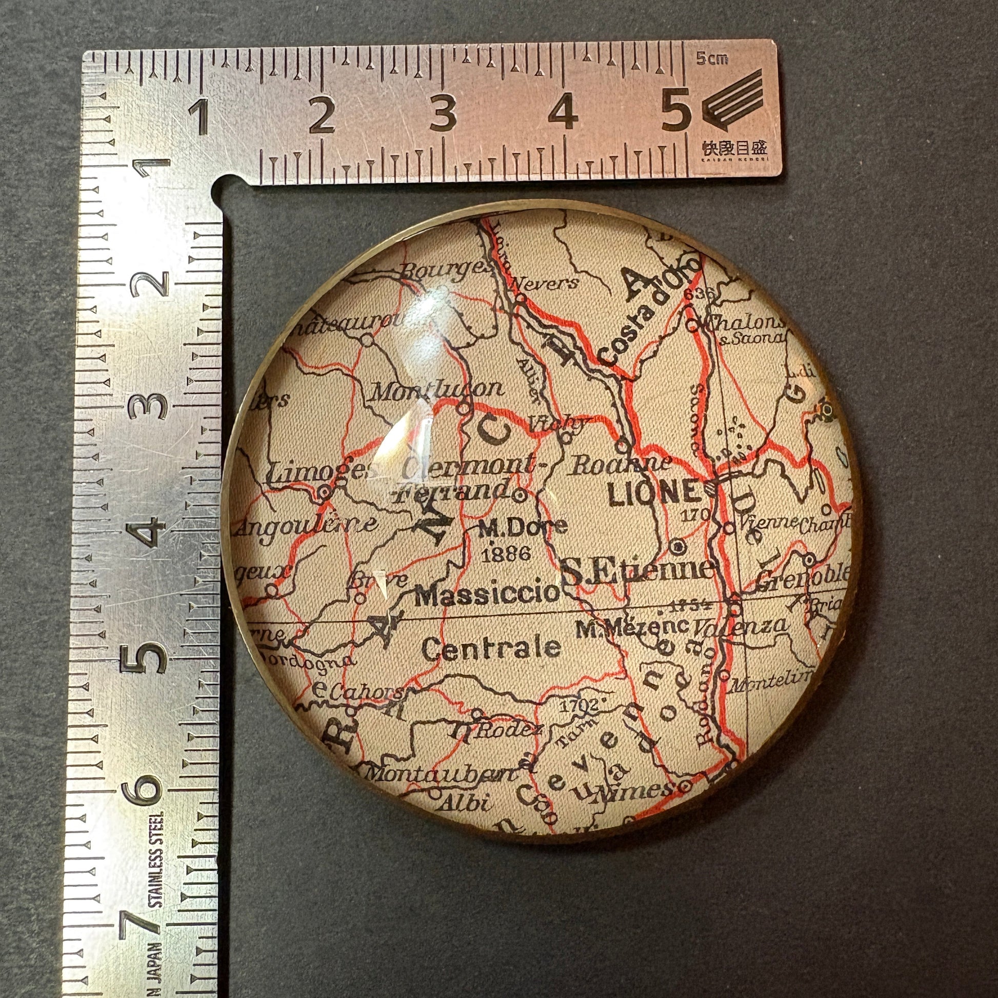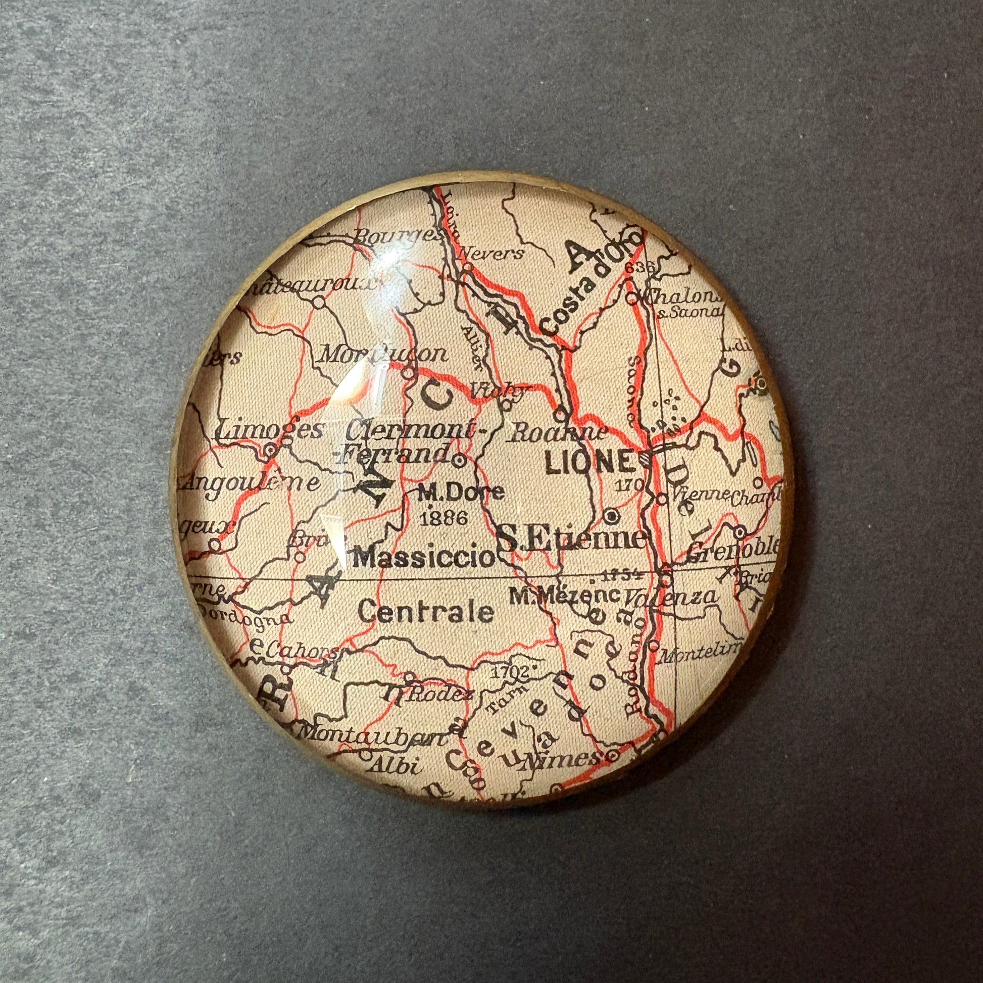 An original piece from a 1932 Atlas, depicting a portion of France during a period of extraordinary historical significance. The map captures the European geopolitical structure prior to the great changes of the century, preserving the nomenclature and borders of a bygone era. Limoges, a historic city renowned for its porcelain manufacturing excellence, stands as a testament to France's rich culture and craftsmanship. Presented on a black velvet stand; wipe clean with a dry cloth. Measures 5 cm in diameter.