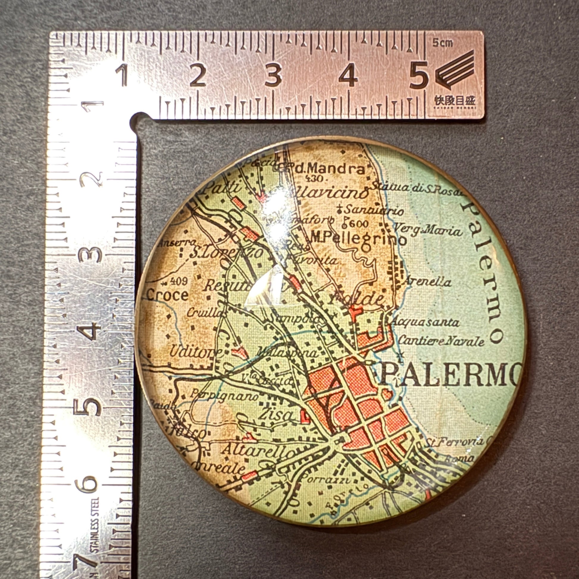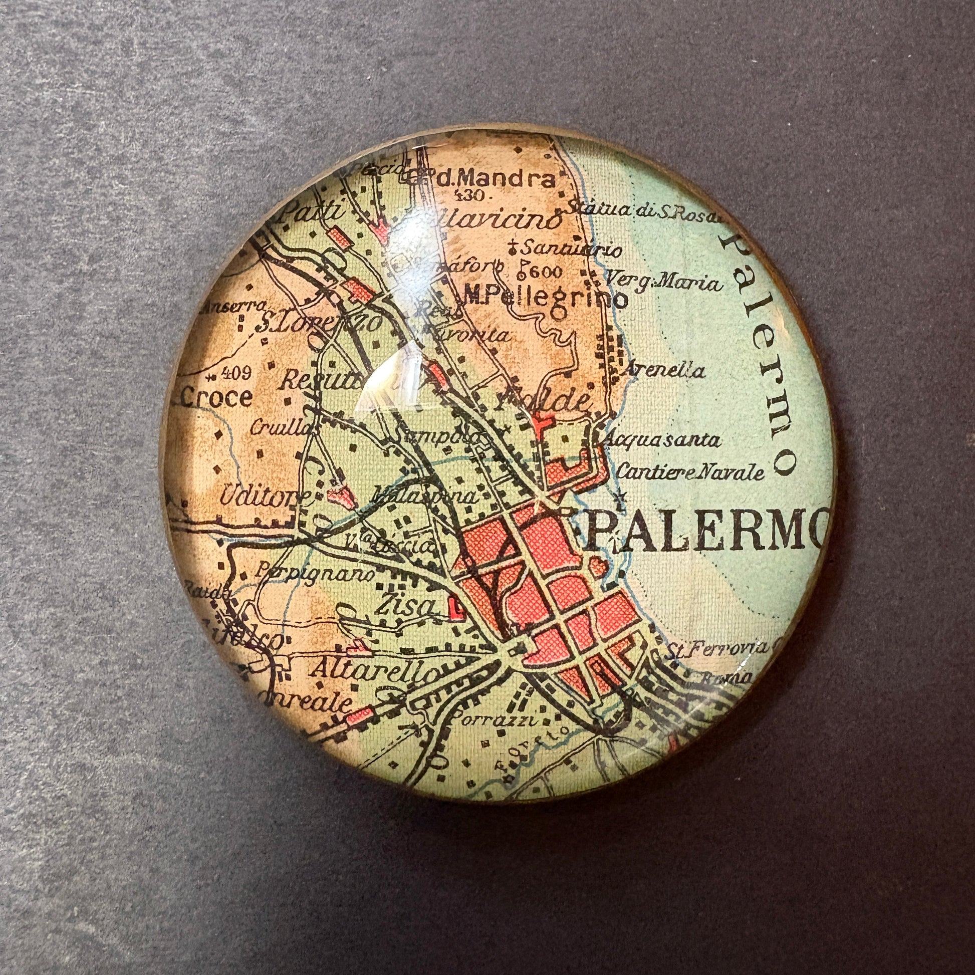 A fascinating look at Palermo through a historic map from 1932. This piece captures authentic fragments of a vintage atlas, when borders and political nomenclature differed significantly from the present. Each image preserves the memory of a bygone era, testifying to the territorial transformations and forgotten names over the decades. Mounted on a black velvet base that enhances the work's preciousness, it represents a fascinating intersection of history, geography, and collective memory. Measures 5 cm in diameter. Wipe clean with a dry cloth.