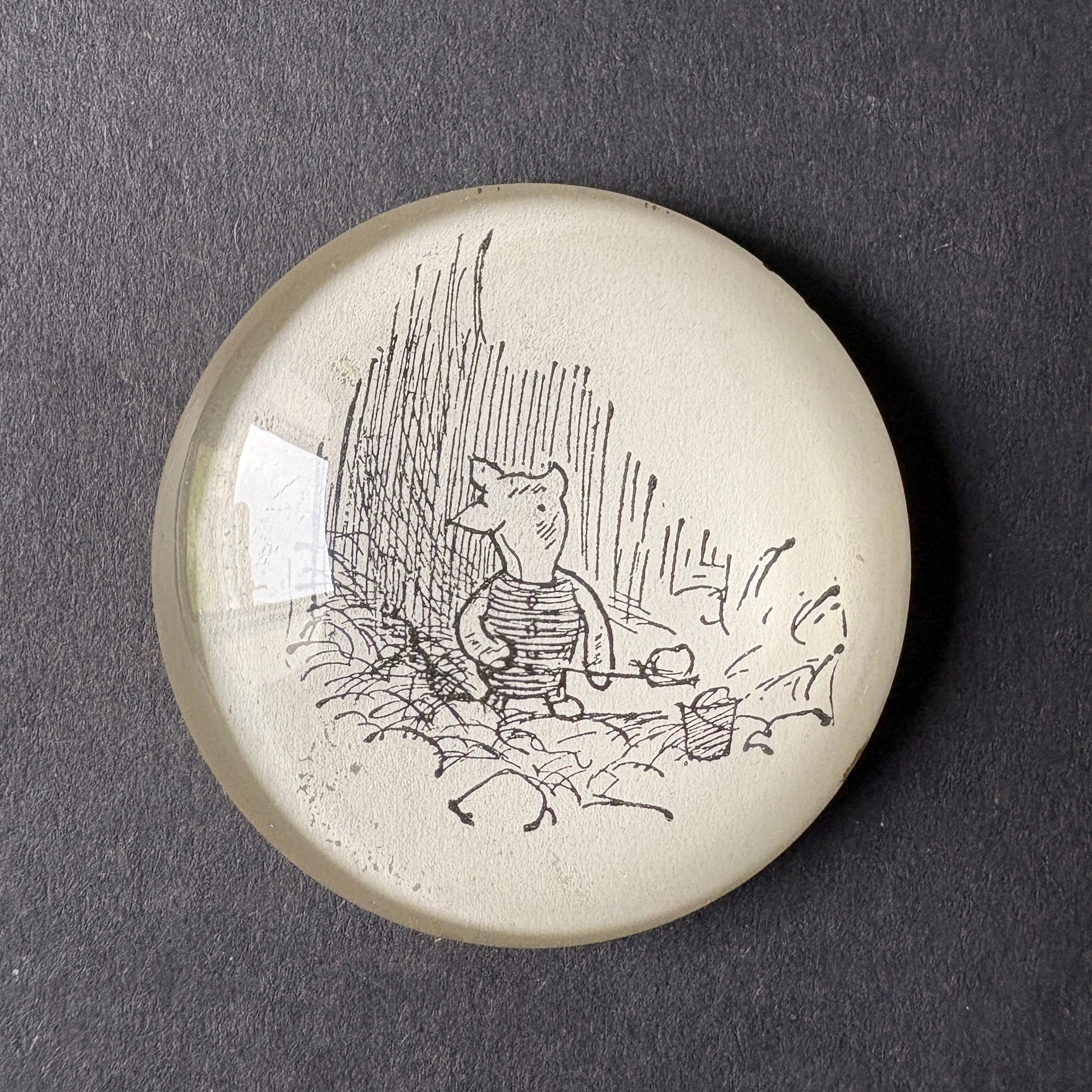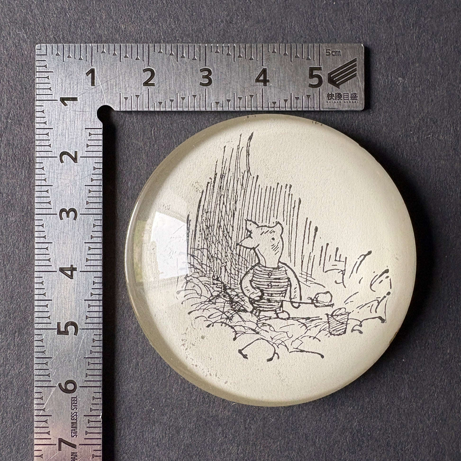 Occhiolino is the ideal companion for those who wish to carry a piece of literary magic with them. This delicate object holds an original 1957 illustration signed by EH Shepard, encapsulated in a 5cm-diameter glass lens. The black velvet-lined back enhances the piece's preciousness, transforming it into an accessory that evokes nostalgia and refinement. Perfect for those who appreciate authentic details and timeless stories. Maintain with care using a dry cloth.