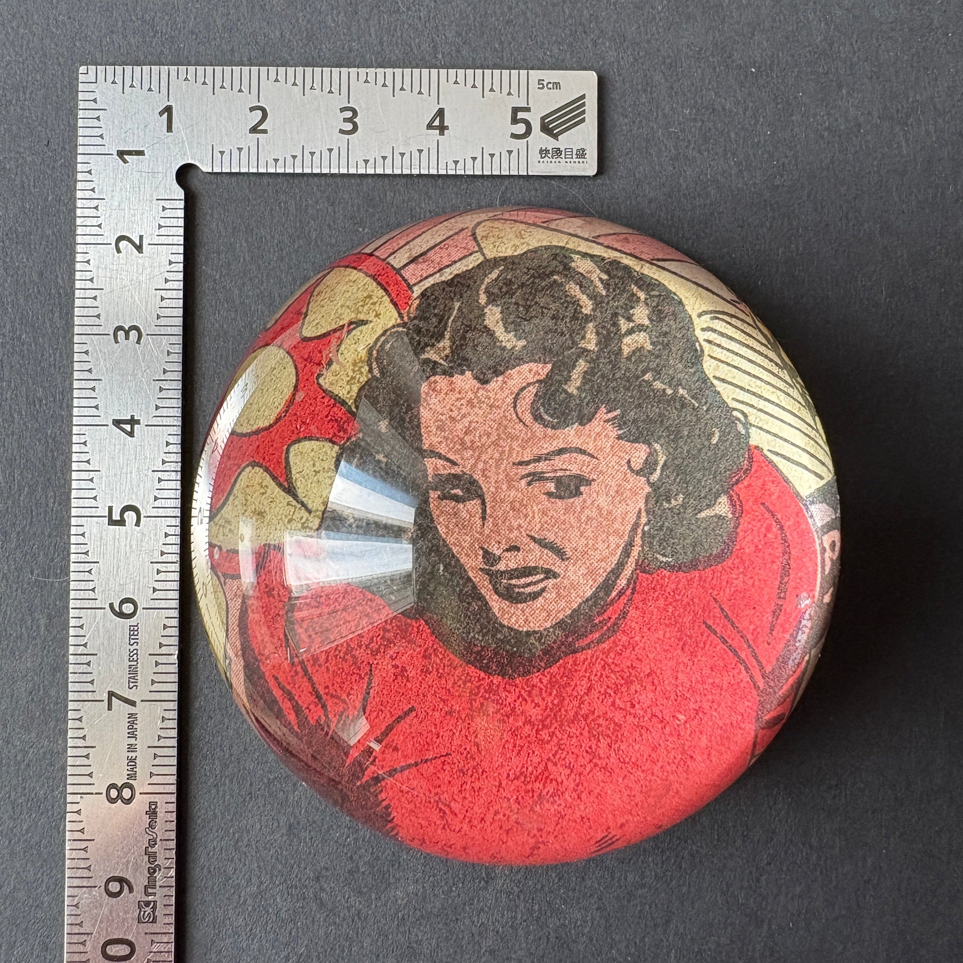 This 7cm-circumference, 3.5cm-high paper press features Dale. The original clipping was taken from a 1965 comic book.