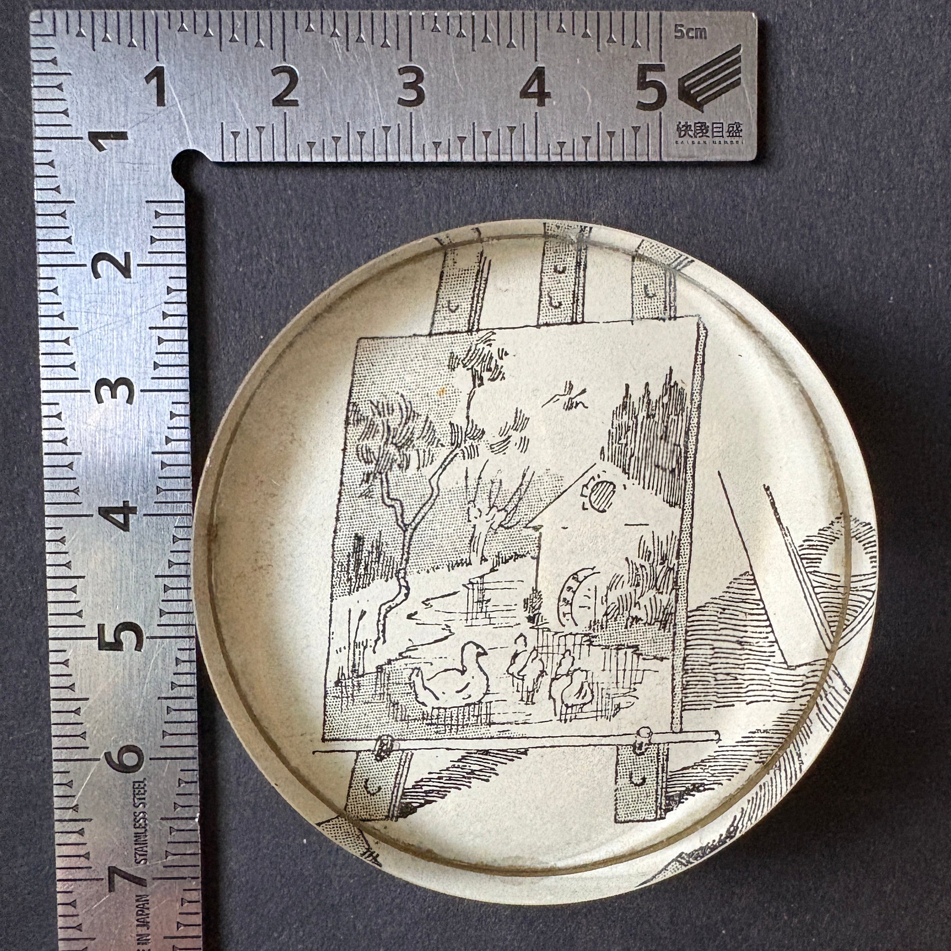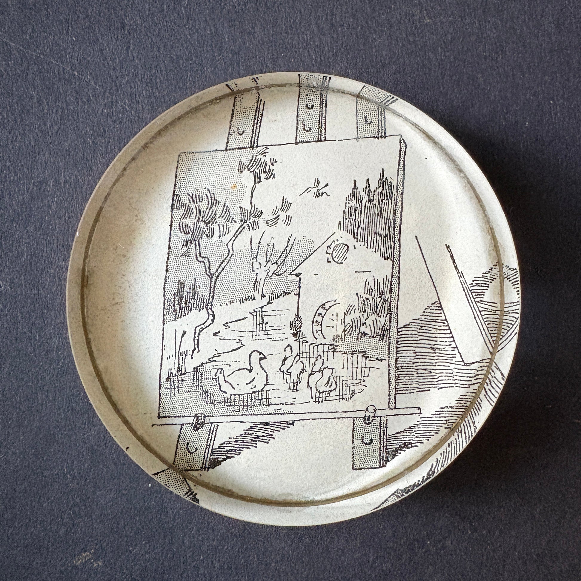 This PostaFerma contains an original clipping dating back to 1890-91, taken from a valuable French volume. The scene depicts an easel-mounted canvas of ducks swimming in a river near a farm. The narrative concludes with a duck so captivated by the realistic and lively image that it dives into the painting, providing the painter with an unexpected and effortless dinner. Round in shape, with a diameter of 5 cm and a height of 1 cm, it rests on a black velvet base and can be cleaned with a dry cloth. This paperweight holds not only papers, but also stories and memories.