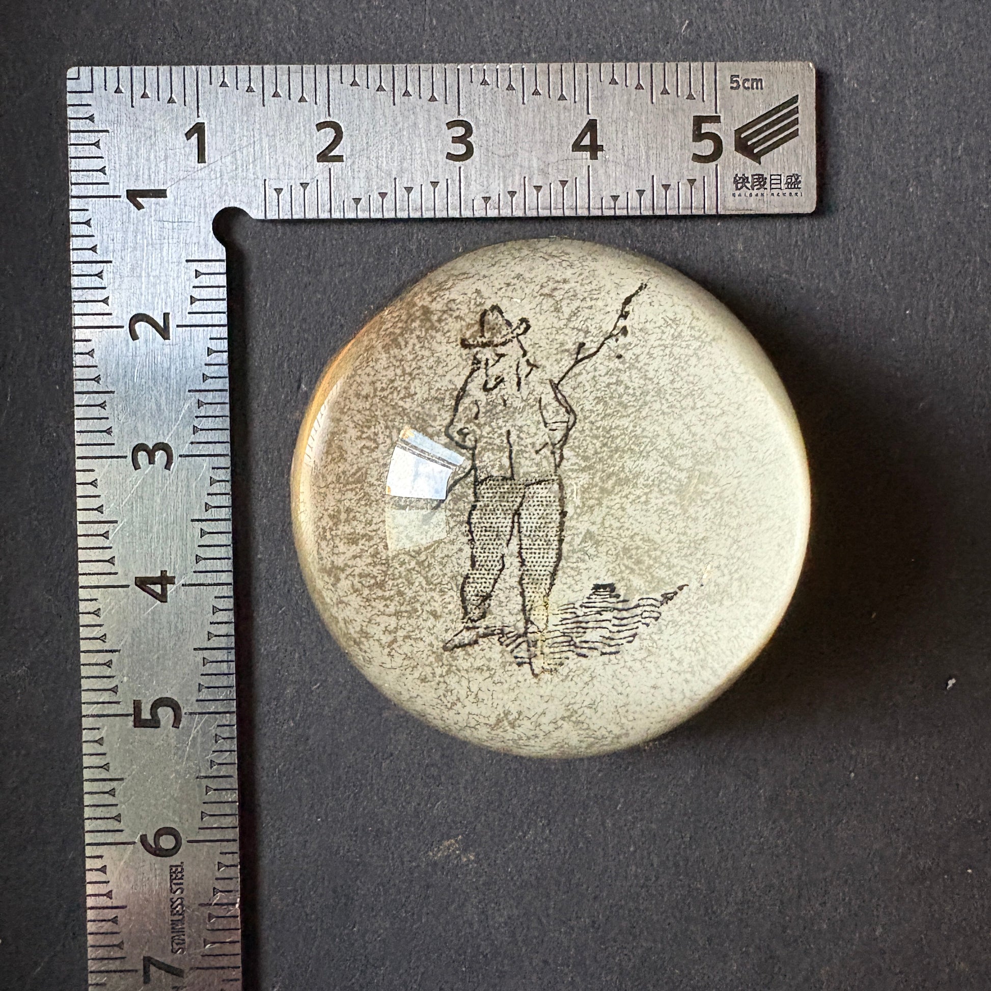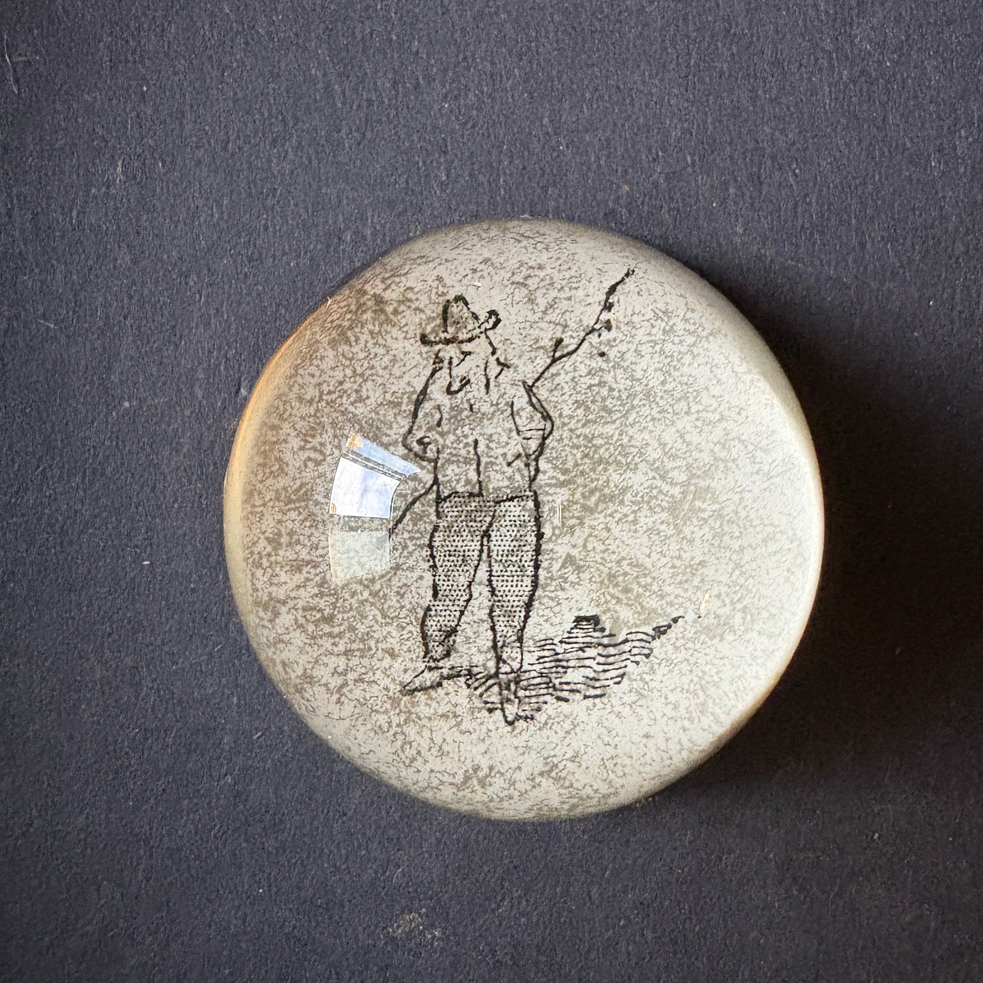 This male figure draws inspiration from an old French volume from 1890, ideal for those who appreciate the bucolic world and the elegance of simple yet precious things. The original illustration comes from the volume "La semaine des familles." Postaferma is round, 3.5 cm in diameter and approximately 2 cm high, with a black velvet stand.
