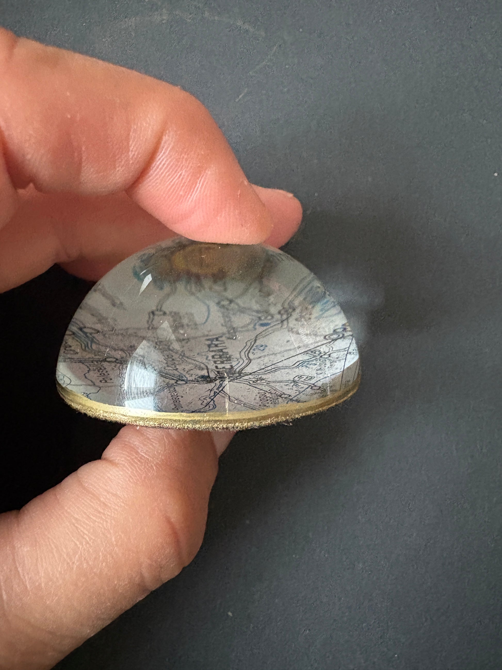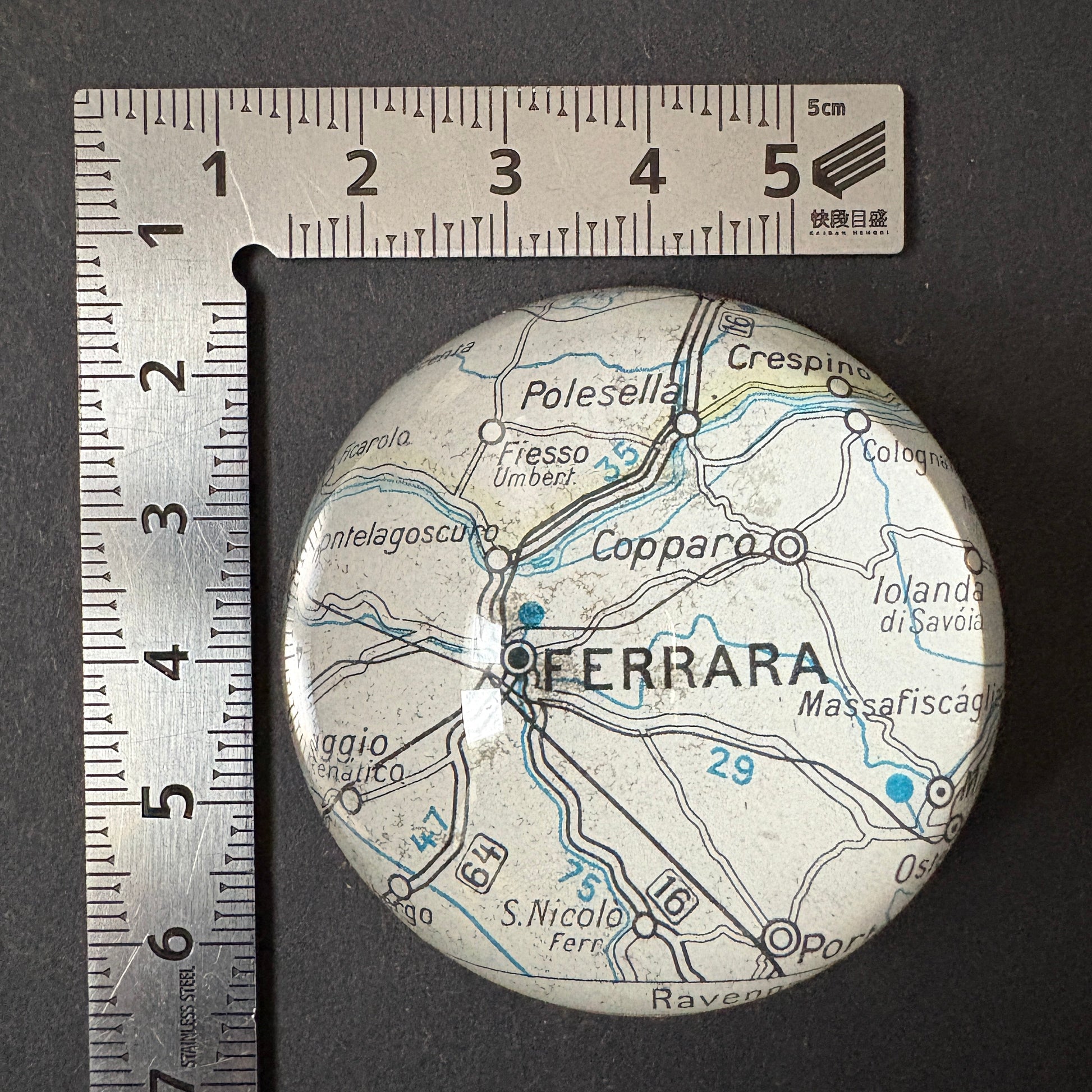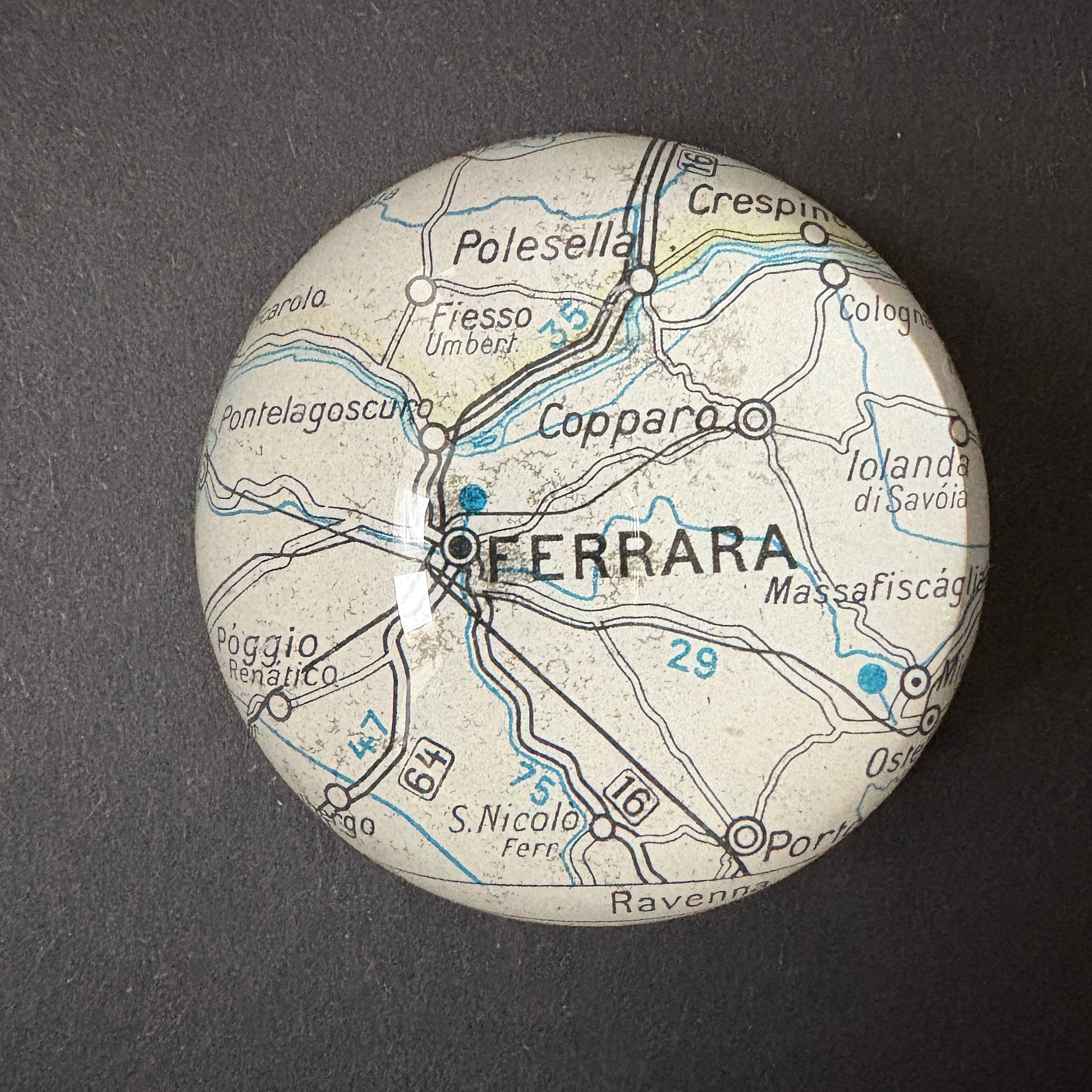 This paperweight, reinvented as 'PostaFerma,' preserves a significant fragment of the Ferrara area. The original clipping, taken from a 1997 TCI Road Atlas, is round with a diameter of 4.6 cm and a height of approximately 2 cm. The base is covered in black velvet. PostaFerma is more than just a paperweight, but a refined treasure chest of memories and words, capable of holding not only papers, but also stories, thoughts, and fragments of life.