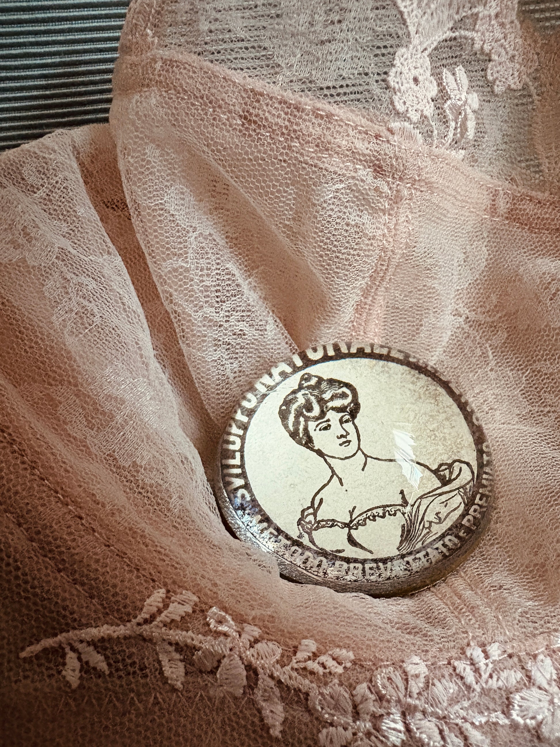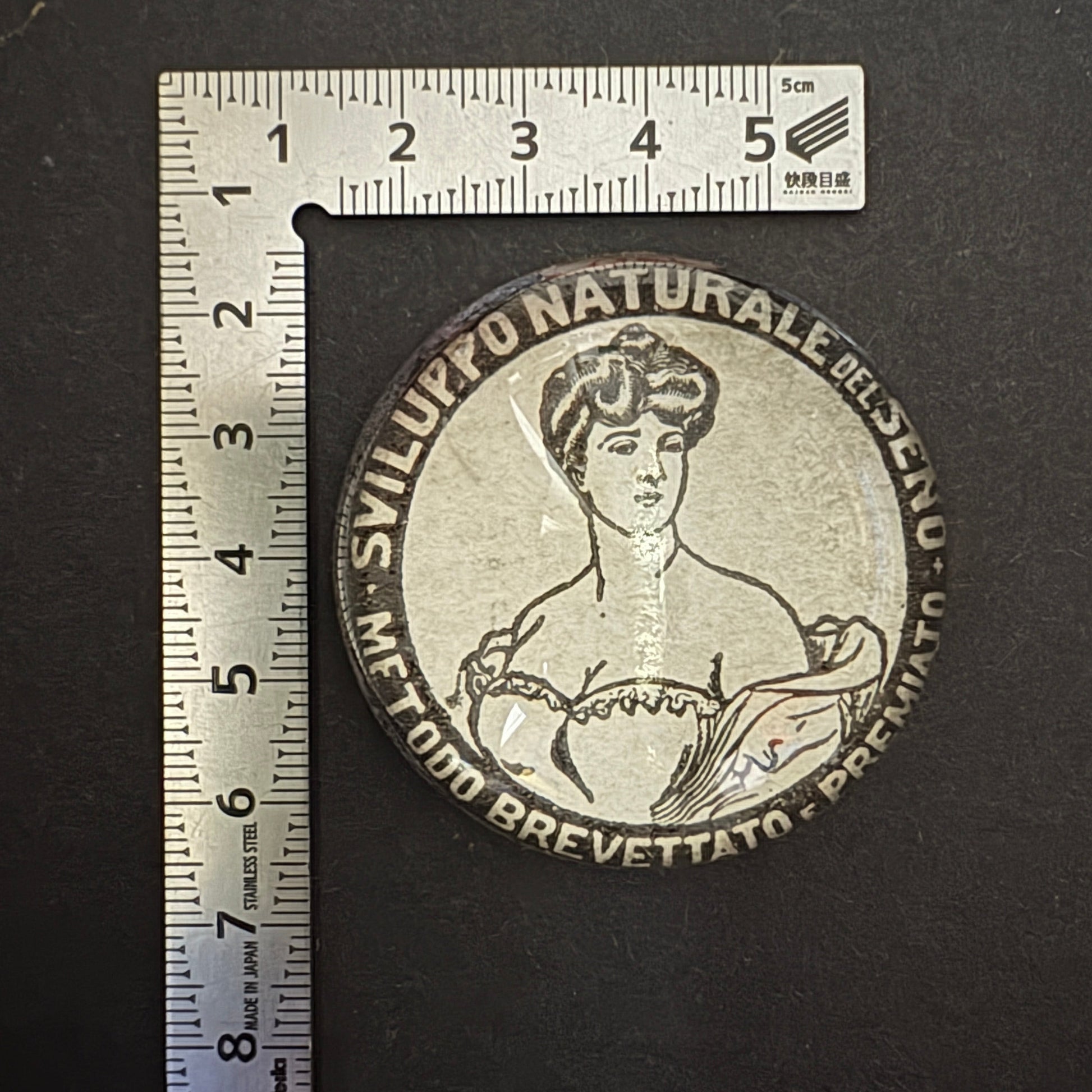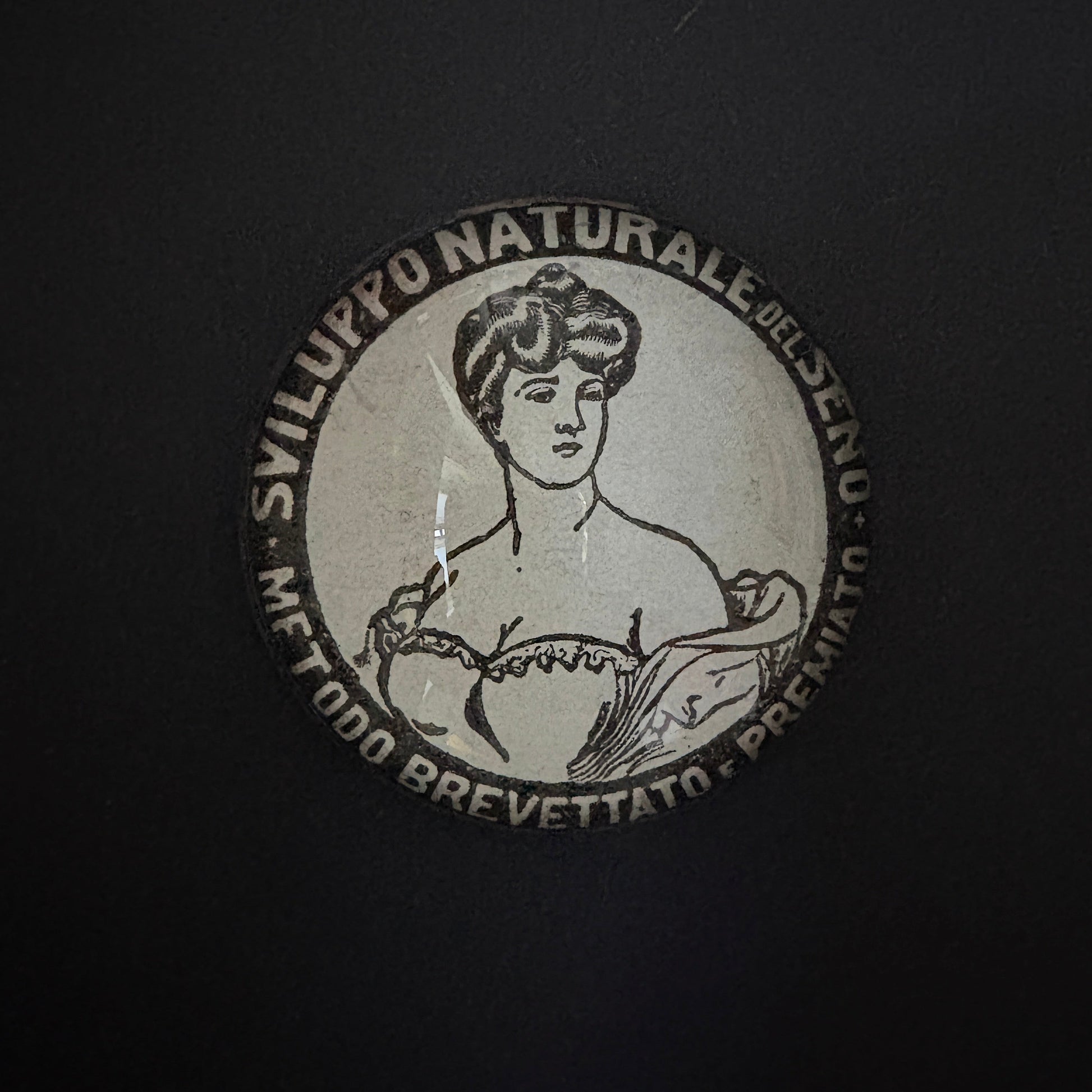 This Posta Ferma, dating back to 1907, combines vintage charm with a refined, playful design. Originally published by the Domenica del Corriere newspaper, it features an advertisement dedicated to natural breast development; perfect for a plastic surgeon's desk. The round stand is 4.9 cm wide and 2 cm high, with a black velvet backing.