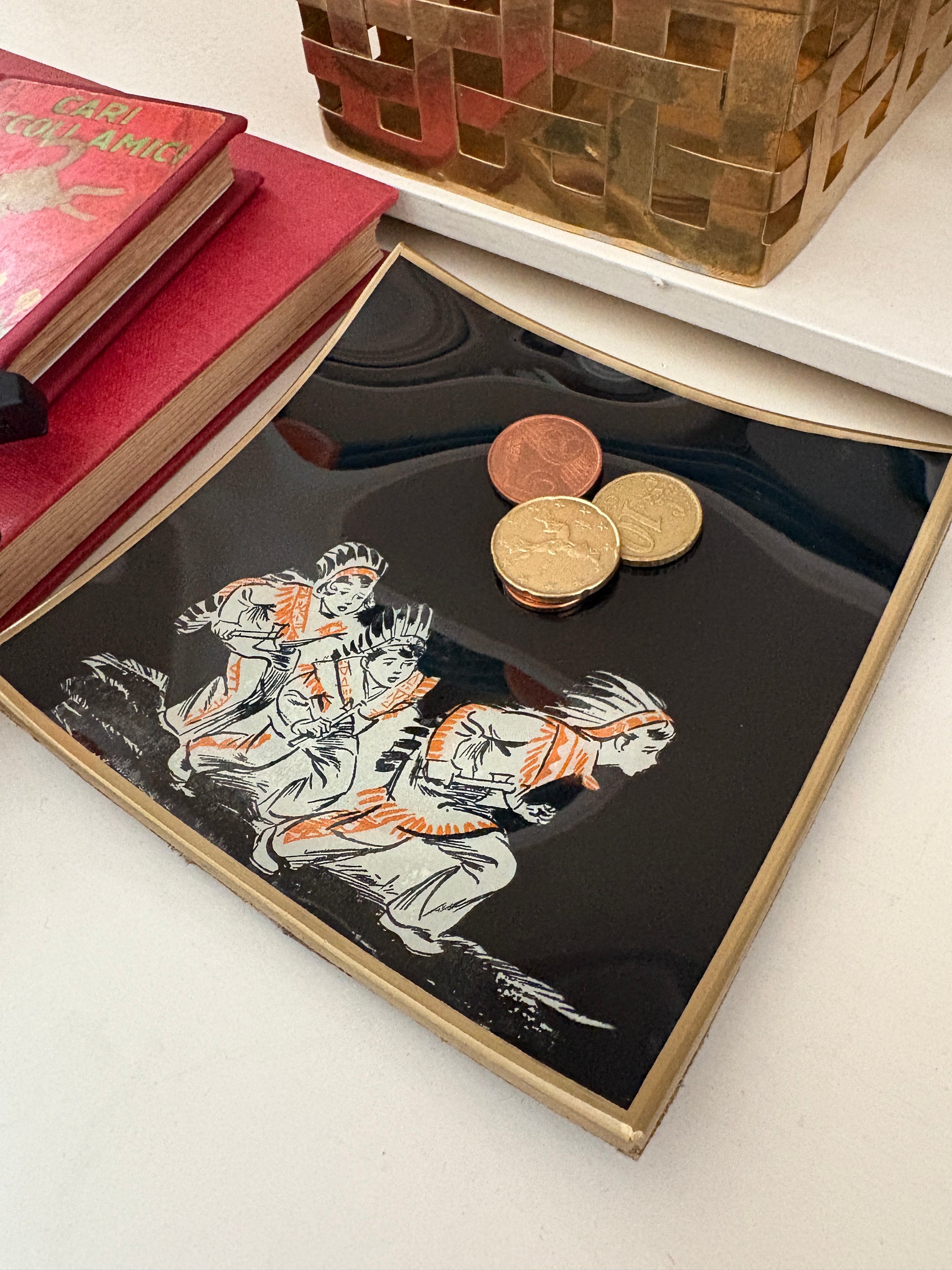 Authentic 1950s piece from "Tricky the Goblin," with illustrations by the renowned London artist Eileen A. Soper. The artwork is enhanced by a black mount that highlights the characteristic style of the era. Dimensions: 11.5 x 11.5 cm. The valet tray features a black velvet base for elegance and protection. Easy care: wipe gently with a damp cloth, avoiding immersion.