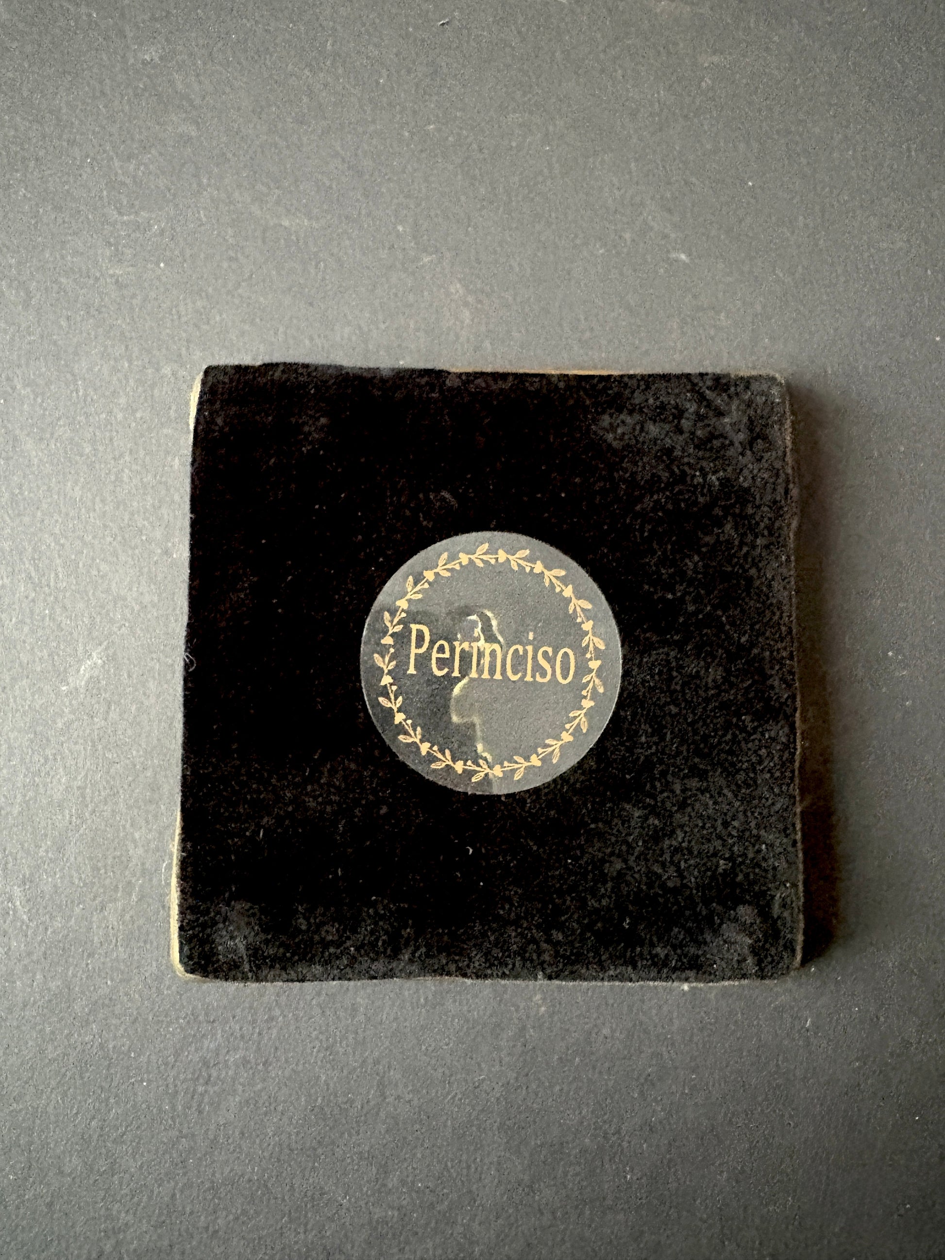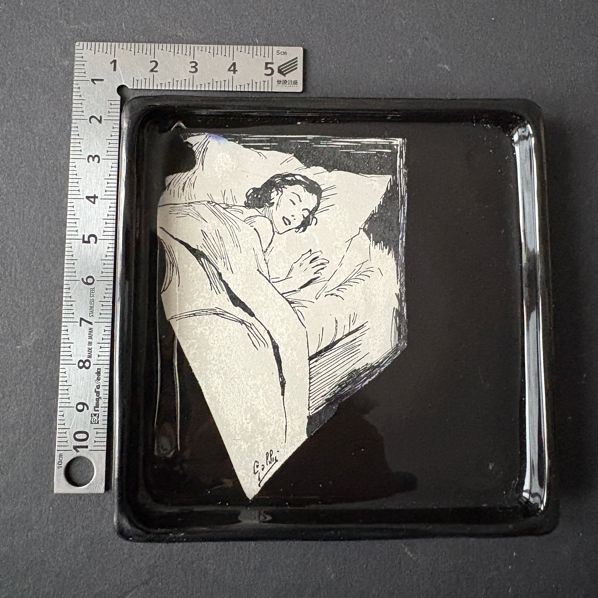 This shelfie, embellished with glass edges and feet, resembles an ashtray and, like all shelfies, can also serve as a refined pocket emptier. The image inside, ideal for placing next to the bed to hold a glass of water, is an illustration by artist Golpe, dated 1953. It measures 10 x 10 cm, with an elegant black velvet background. Clean with a damp cloth, avoiding getting the object wet.