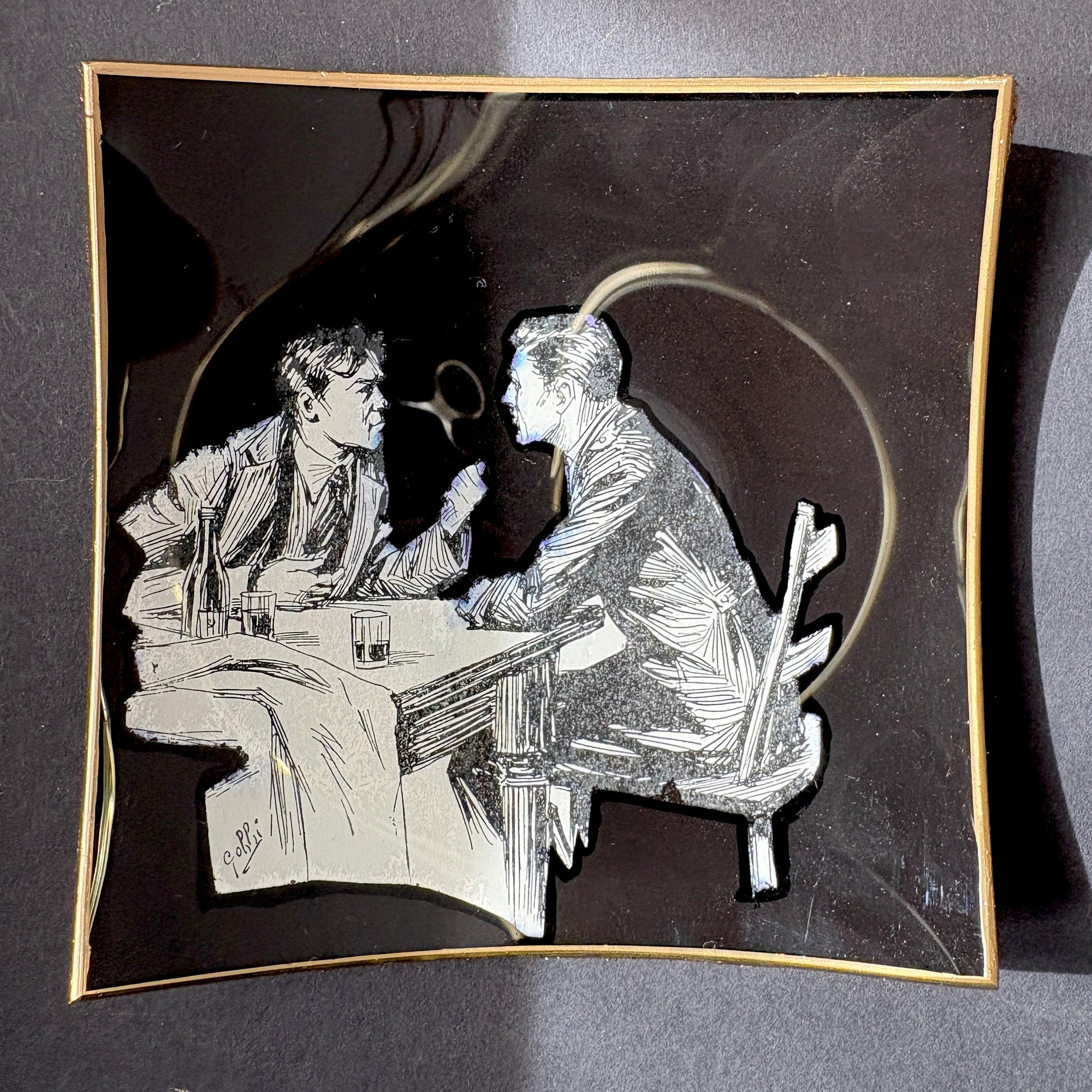 An authentic 1953 piece from "Marina ei segugi." This elegant valet tray would make the ideal gift for those you share moments of conviviality and conversation with. Dimensions: 11.5 x 11.5 cm. Finished with a black velvet base. Easy care: wipe gently with a damp cloth, avoiding immersion.