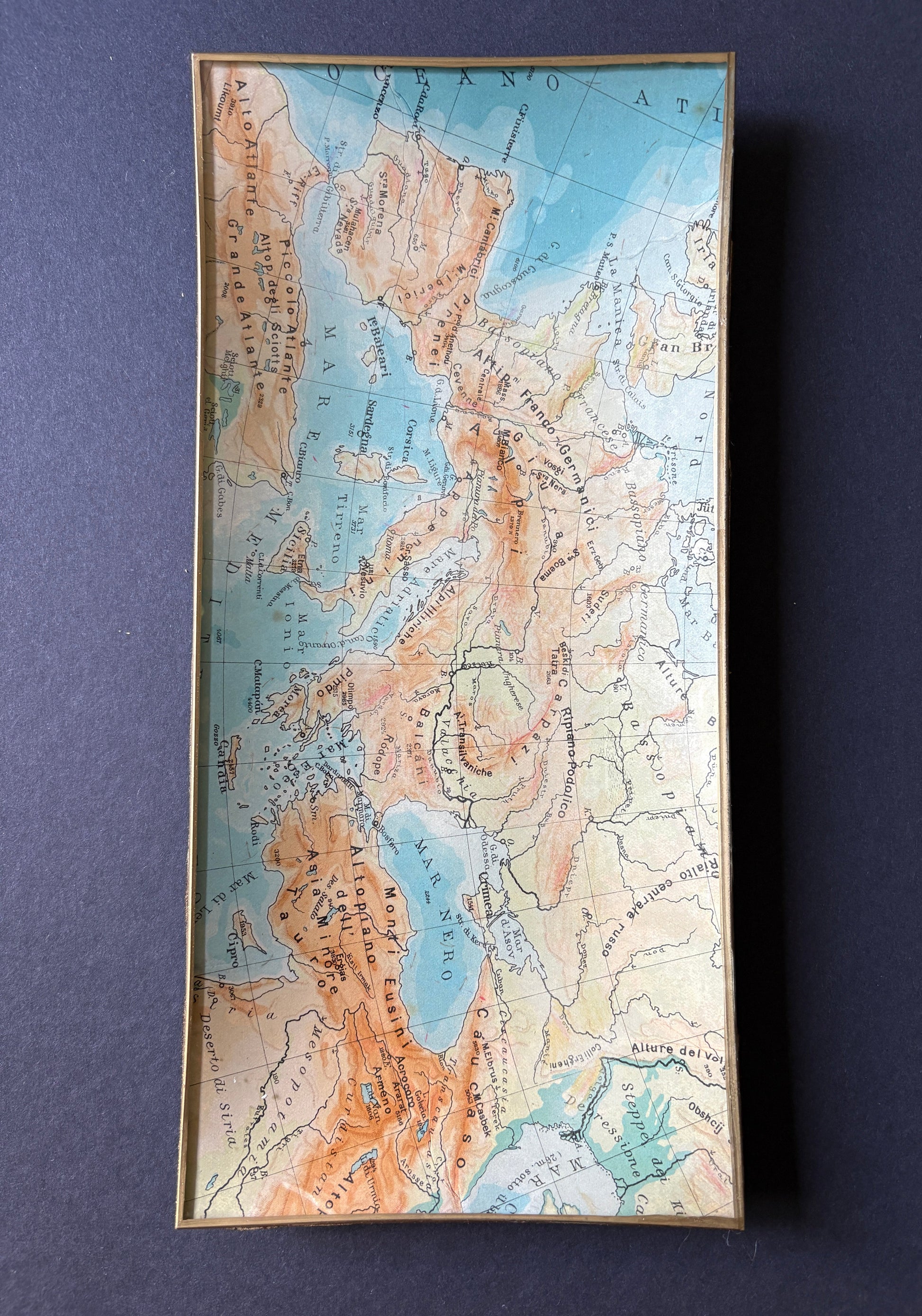 This authentic 1932 piece comes from a De Agostini Atlas and captures a fascinating moment in history. The physical map of Europe reveals a geography profoundly different from today's, testifying to the turbulent period between the two world wars. While the effects of the Great War remain evident, omens of the impending geopolitical upheavals are already emerging. Mounted on black velvet, it measures 26 x 12 cm. Store with care, using a damp cloth for cleaning, avoiding getting the piece wet.