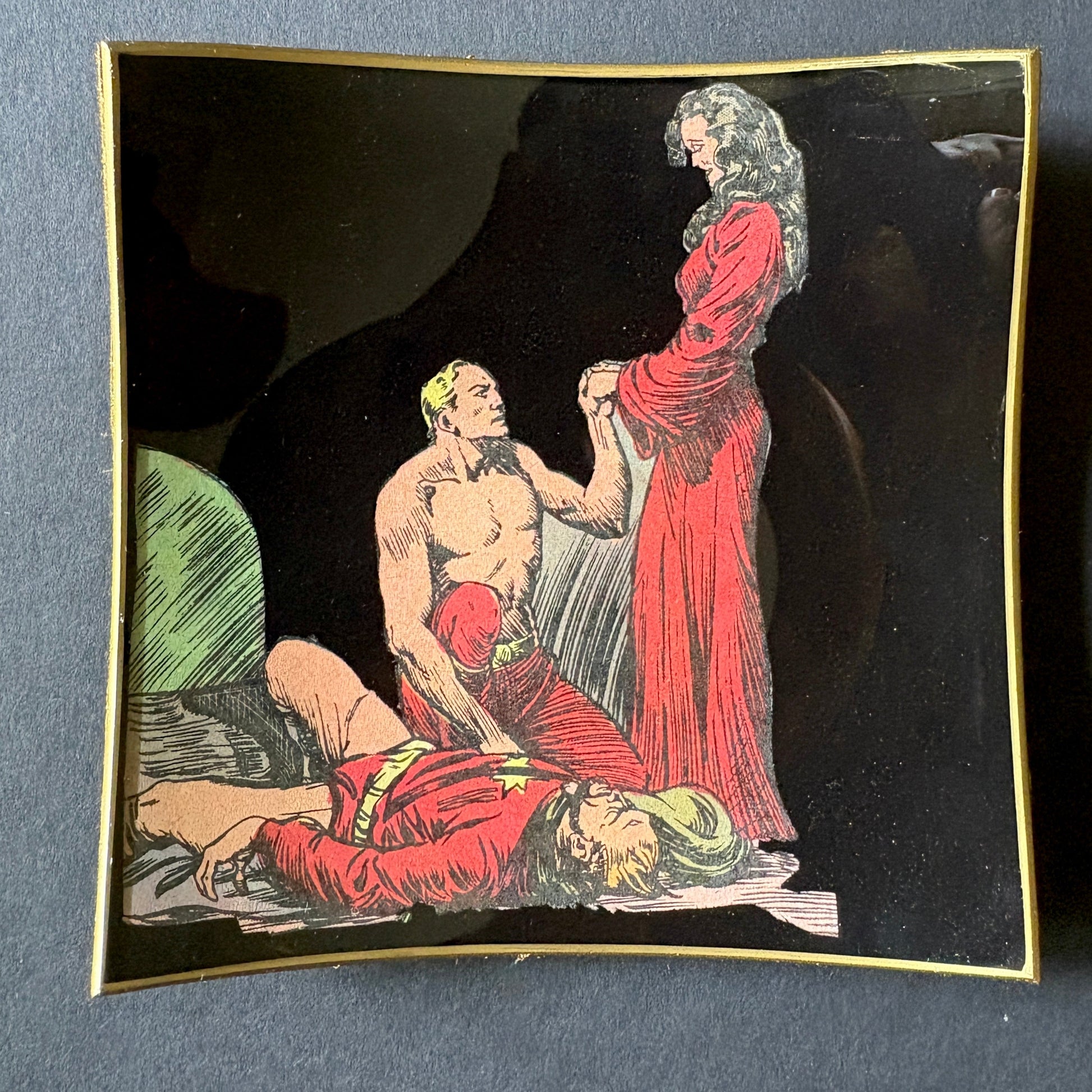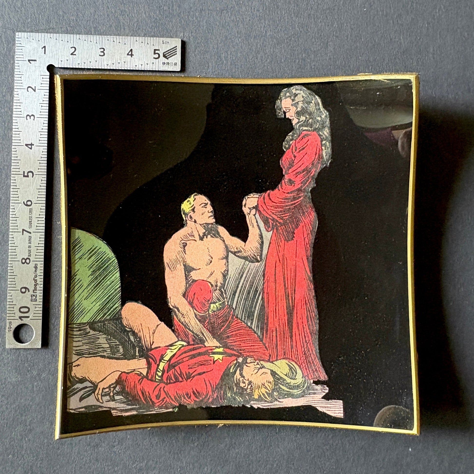 Authentic 1964 piece from the mythological series "King Gordon vs. Ming." This work's uniqueness lies in its precise cutting technique combined with its presentation on a hand-painted black backing, a solution that effectively enhances the color palette of the comic book original. Dimensions: 11.5 x 11.5 cm. Mounting on a black velvet base ensures protection and aesthetic refinement. Care instructions: Wipe clean with a cloth, avoid contact with water.