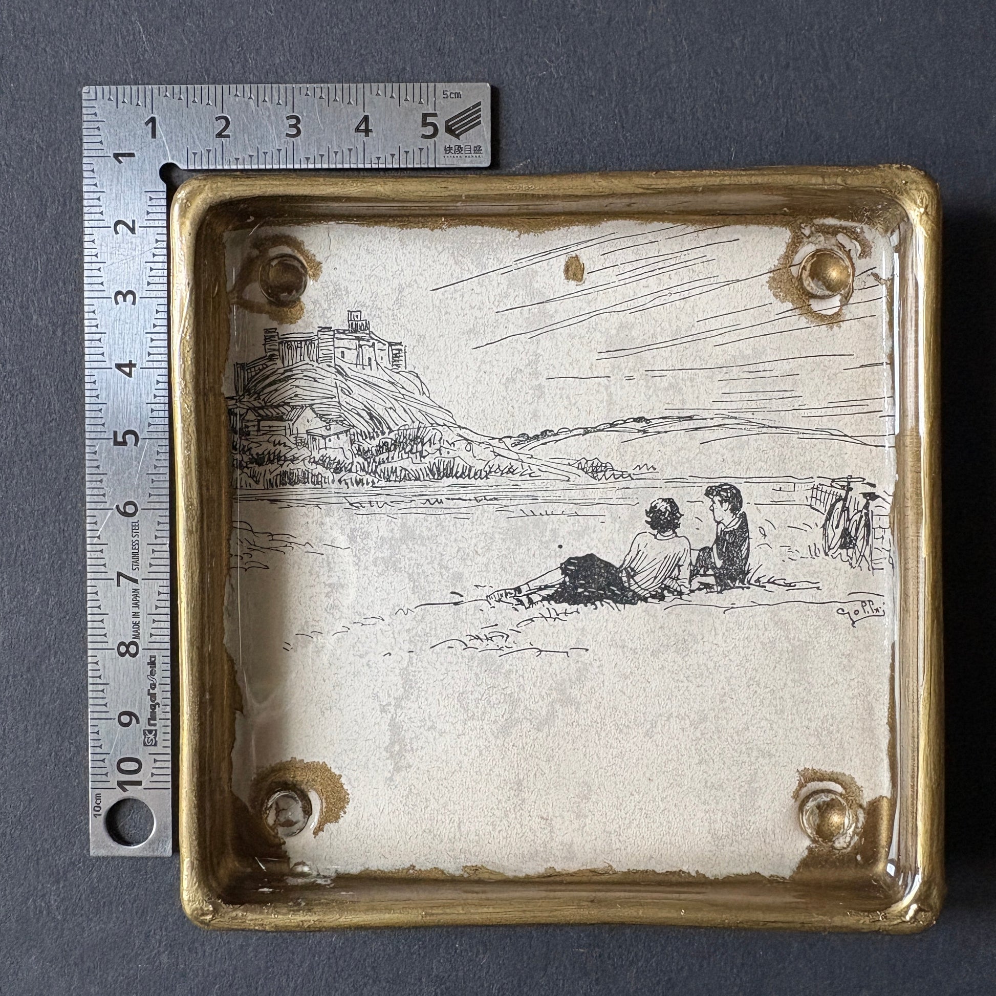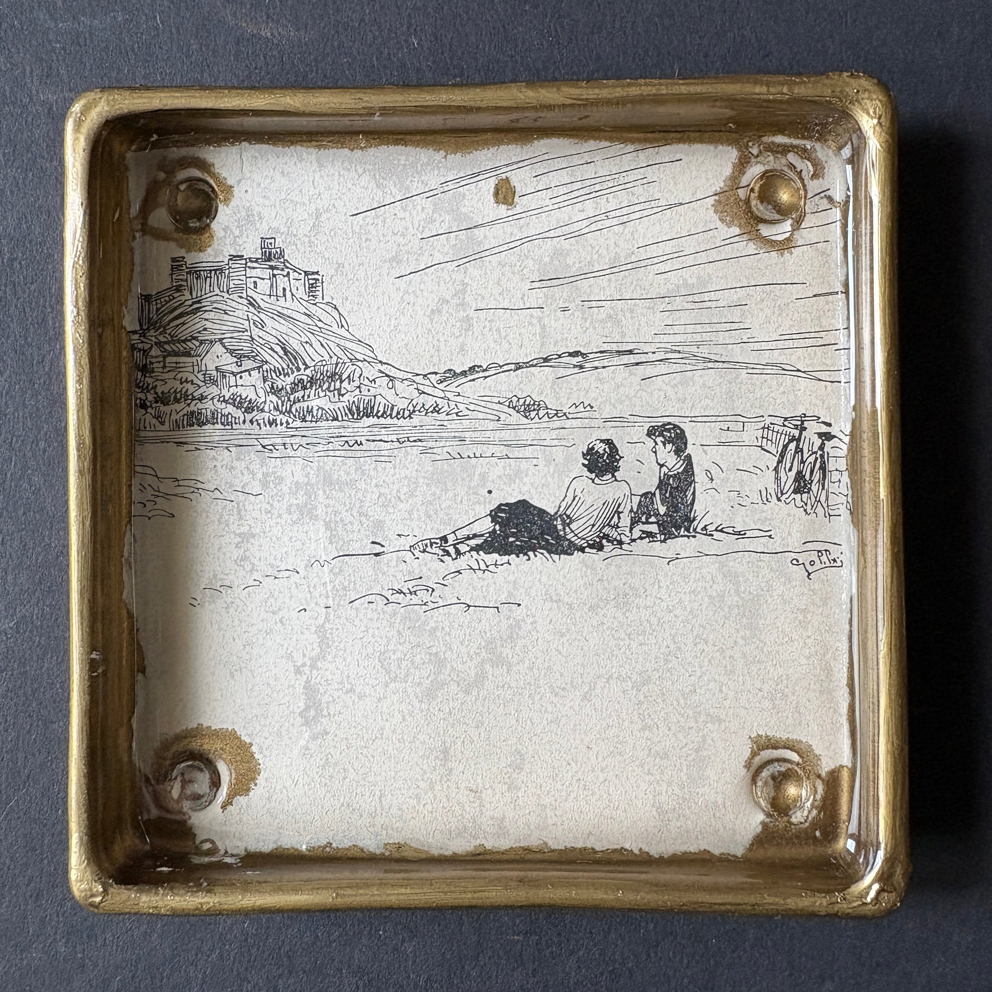 This shelfie, with glass edges and feet, resembles an ashtray and could also be used, like all the others, as a pocket emptier. Adding to its uniqueness and elegance, gold accents enhance the vintage feel. The featured clipping dates back to 1953 and was taken from "Marina ei segugi" by Baldini and Castoldi.