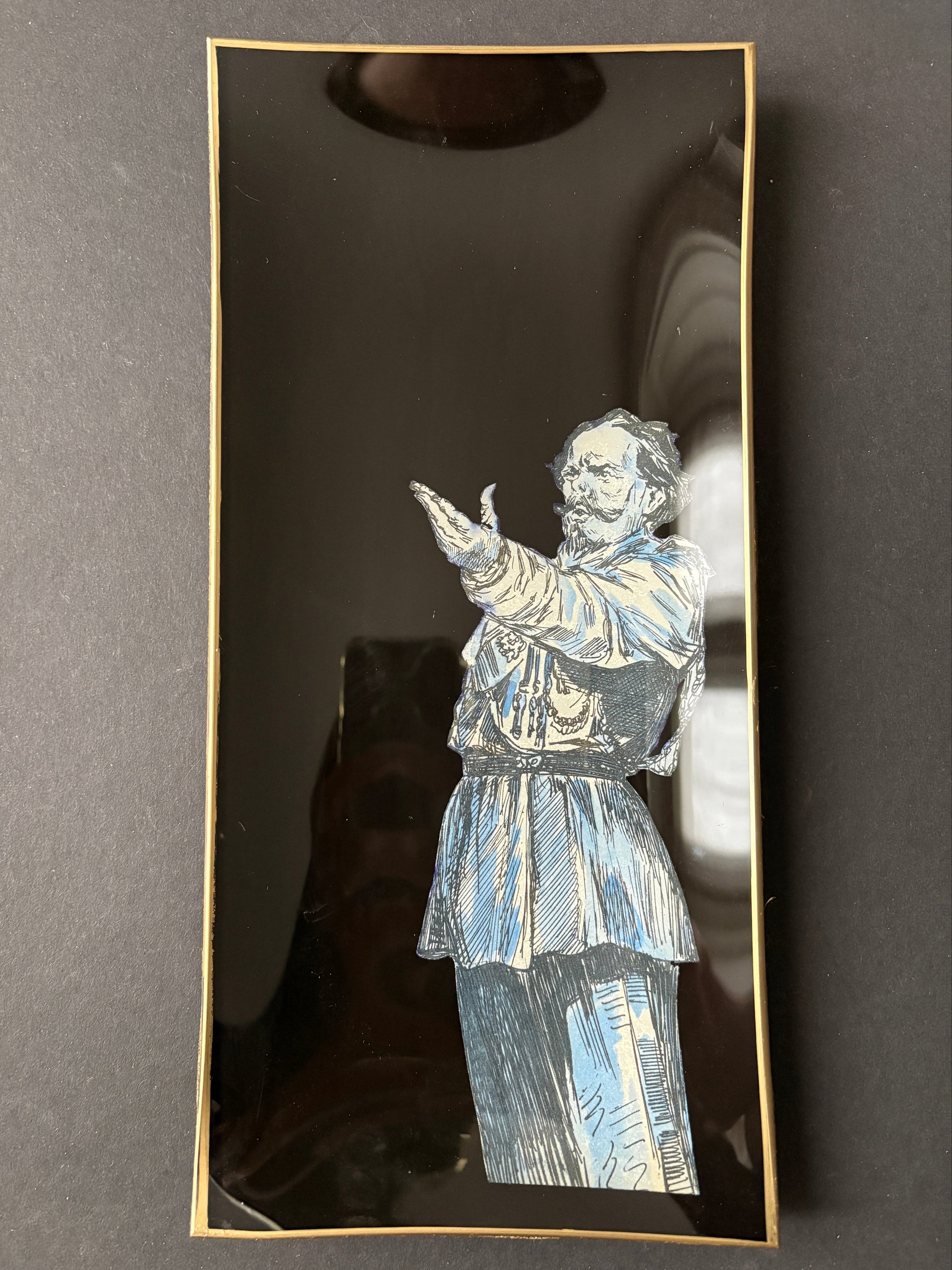 Tito Speri, a celebrated Italian patriot, distinguished himself for his decisive participation in the defense of Brescia during the Five Days of 1849, fighting for independence and national unity. This elegant rectangular shelfie measures 26 x 12 cm and is embellished with a 1960 design by Gastone Regosa, with a velvet backing. For cleaning, we recommend using a dry cloth, avoiding moisture.