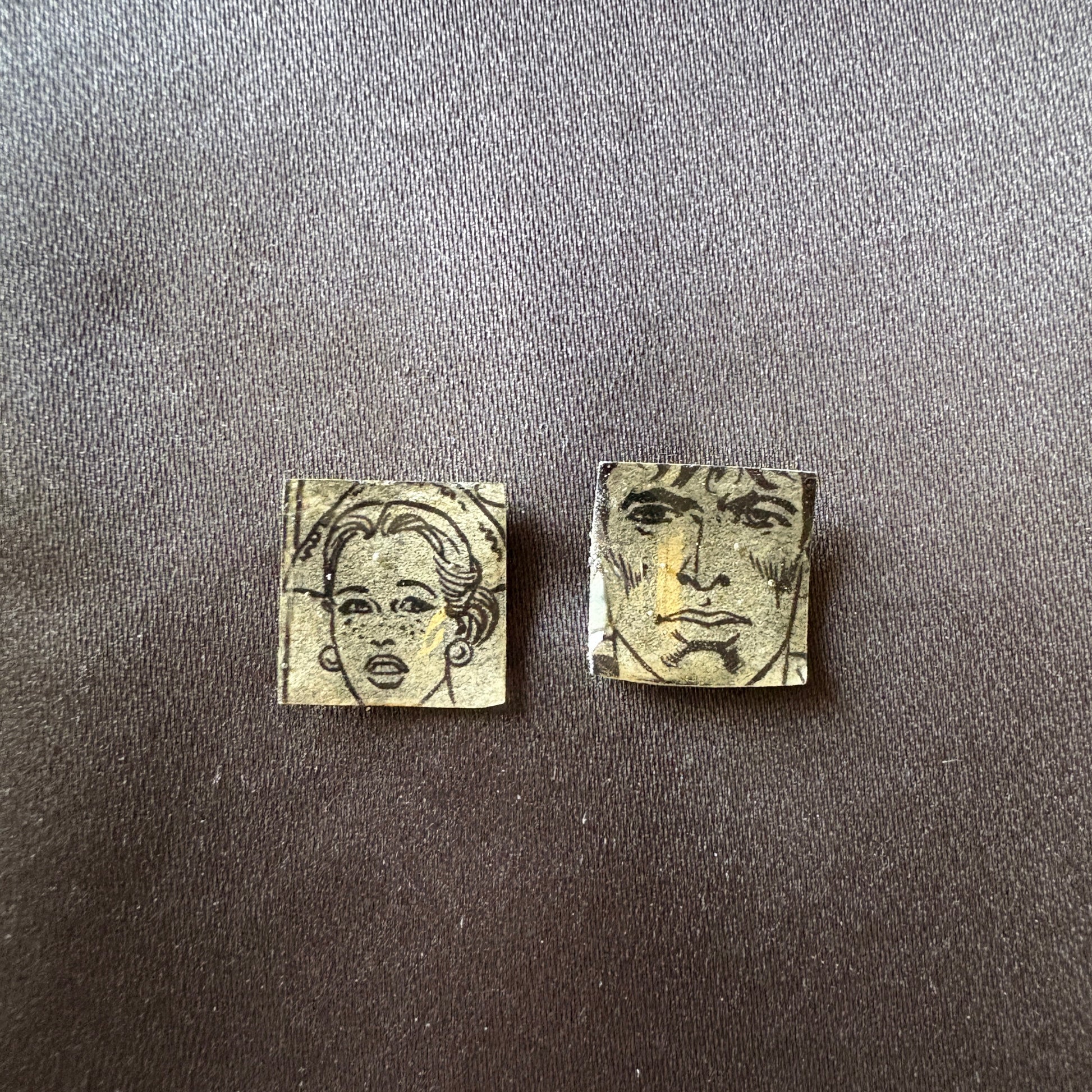 Echo rappresenta il nome della mia collezione di orecchini, e questo modello è creato da un fumetto originale. Sono orecchini a perno con chiusura a vite, realizzati in resina e decorati con ritagli autentici presi dal Dylan Dog n.17, "La Dama in nero", degli anni ’90. Si consiglia di evitare il contatto con l’acqua per preservarne la qualità.