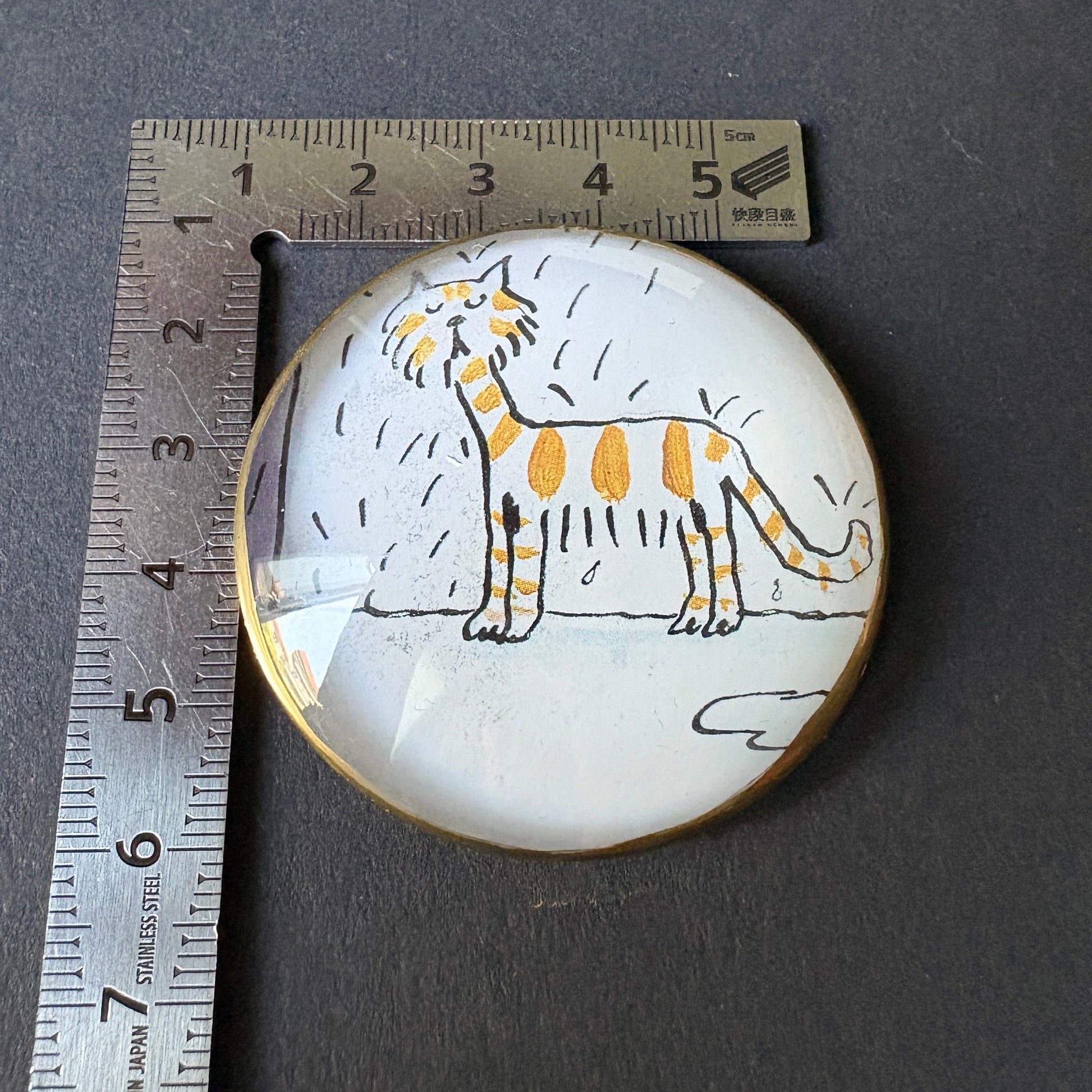 per gli amanti dei gatti e soprattutto dei gatti rossi! Un Occhiolino, in grado di comunicare il loro carattere particolare e la loro simpatia in un'immagine originale del 2000 tratta da un libro per bambini illustrato da Ailie Busby. Le misure sono di 5cm di diametro; la parte superiore è in vetro mentre il fondo è in velluto. Pulire con un panno morbido stando attenti a non bagnare l'oggetto.