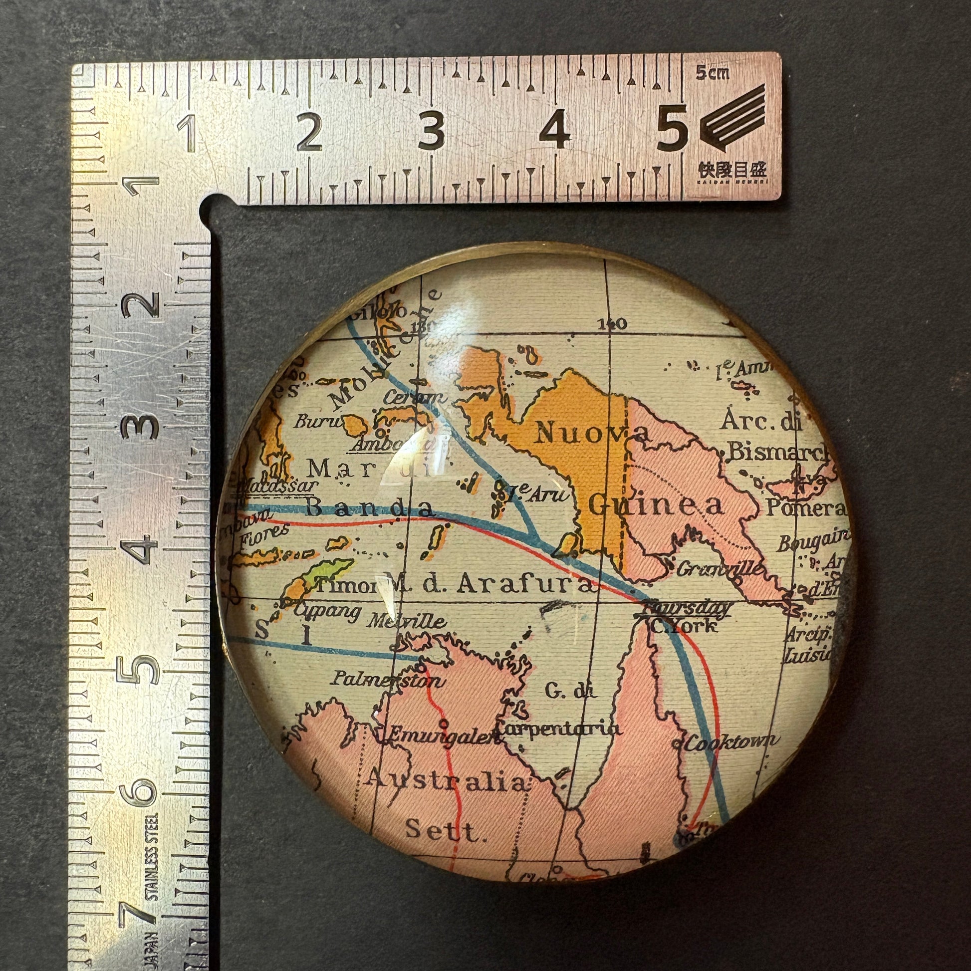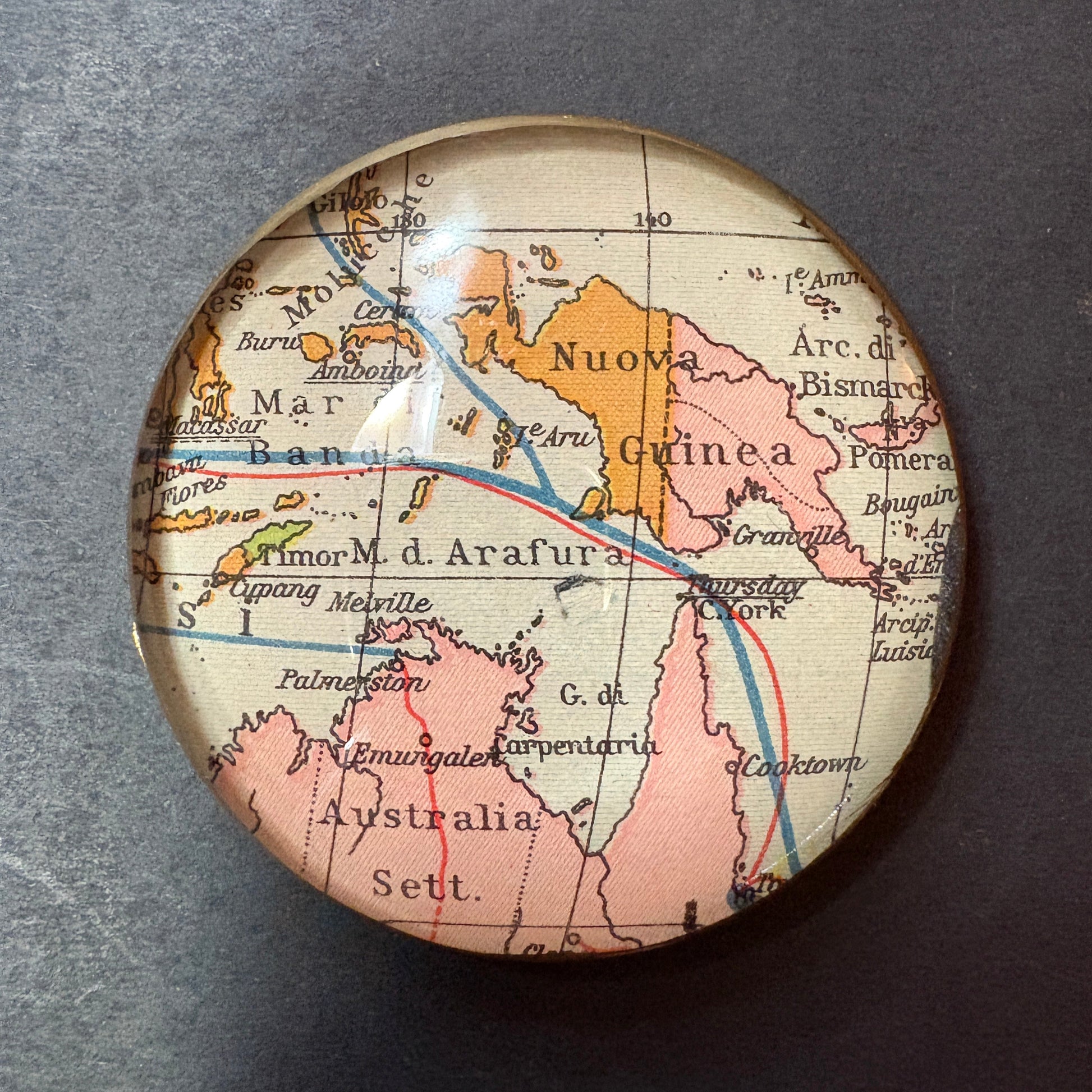 Questo Occhiolino riporta al suo interno una preziosa mappa del 1932. La tavolozza cromatica affascinante rende il pezzo un oggetto da collezione ideale per la scrivania, mentre la rappresentazione storica della Nuova Guinea e dell'Australia Settentrionale testimonia un momento specifico della cartografia mondiale.