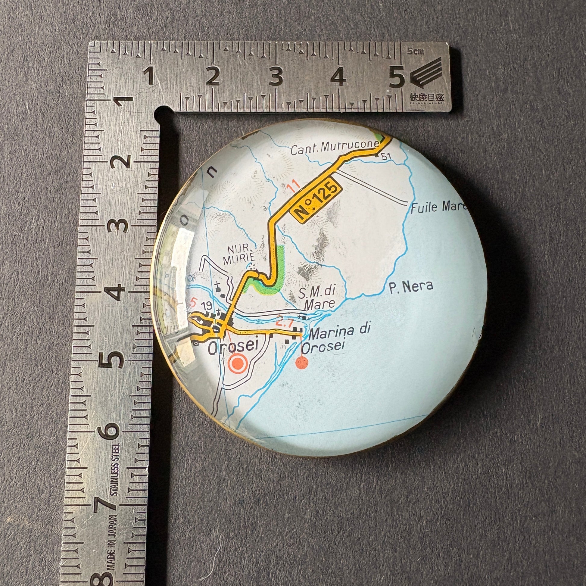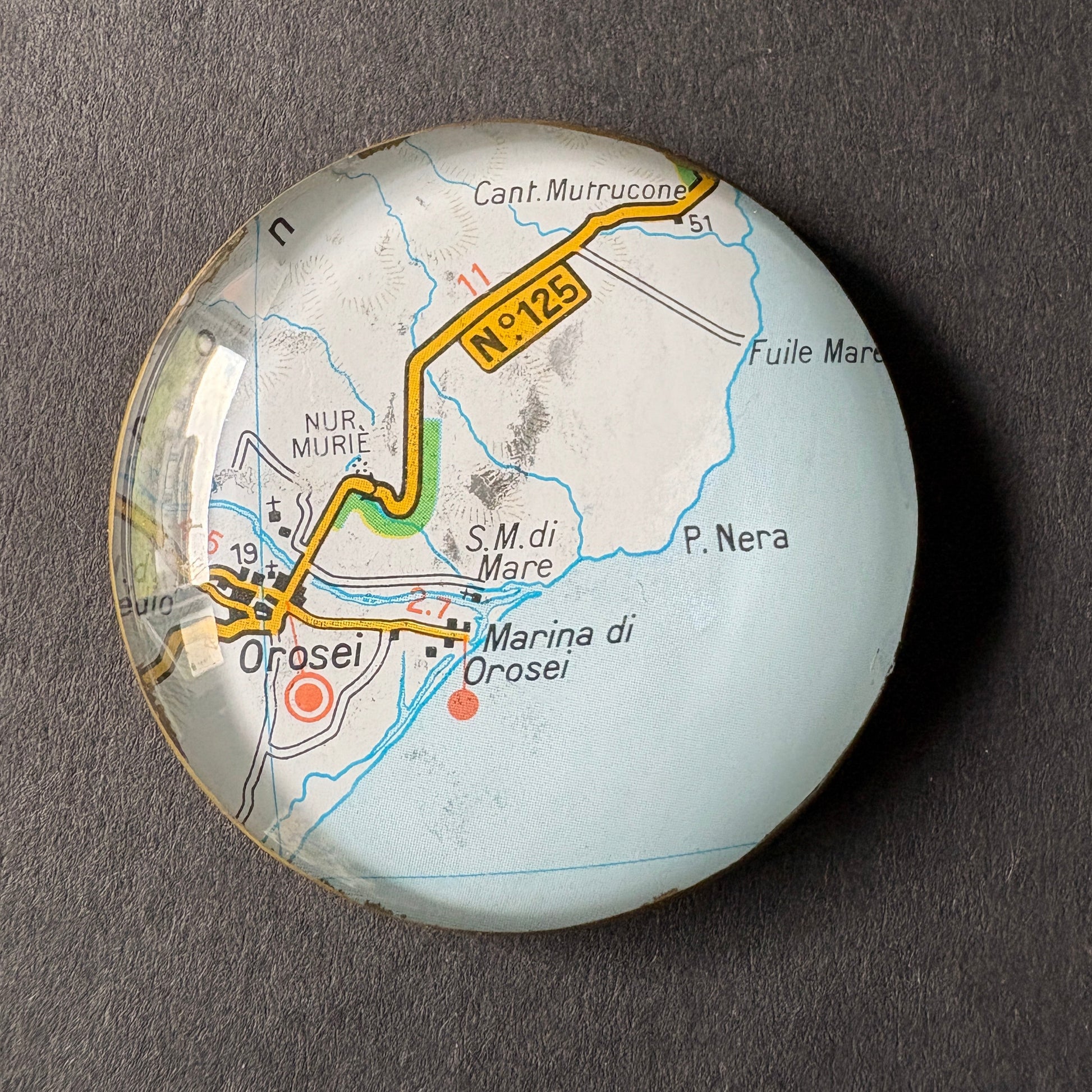 Uno sguardo sulle straveder raggiungere Orosei catturato da una carta stradale d'epoca del 1997. Questo delicato oggetto racchiude frammenti di territorio italiano sotto una cupola di vetro, trasformando la geografia in un ricordo tangibile. Perfetto per chi desidera portare con sé un pezzo di storia locale o rivivere momenti indimenticabili attraverso la lente della nostalgia. Realizzato con cura artigianale: vetro superiore e velluto nero inferiore. Conservare con delicatezza, pulendo con panno morbido e evitando l'umidità.