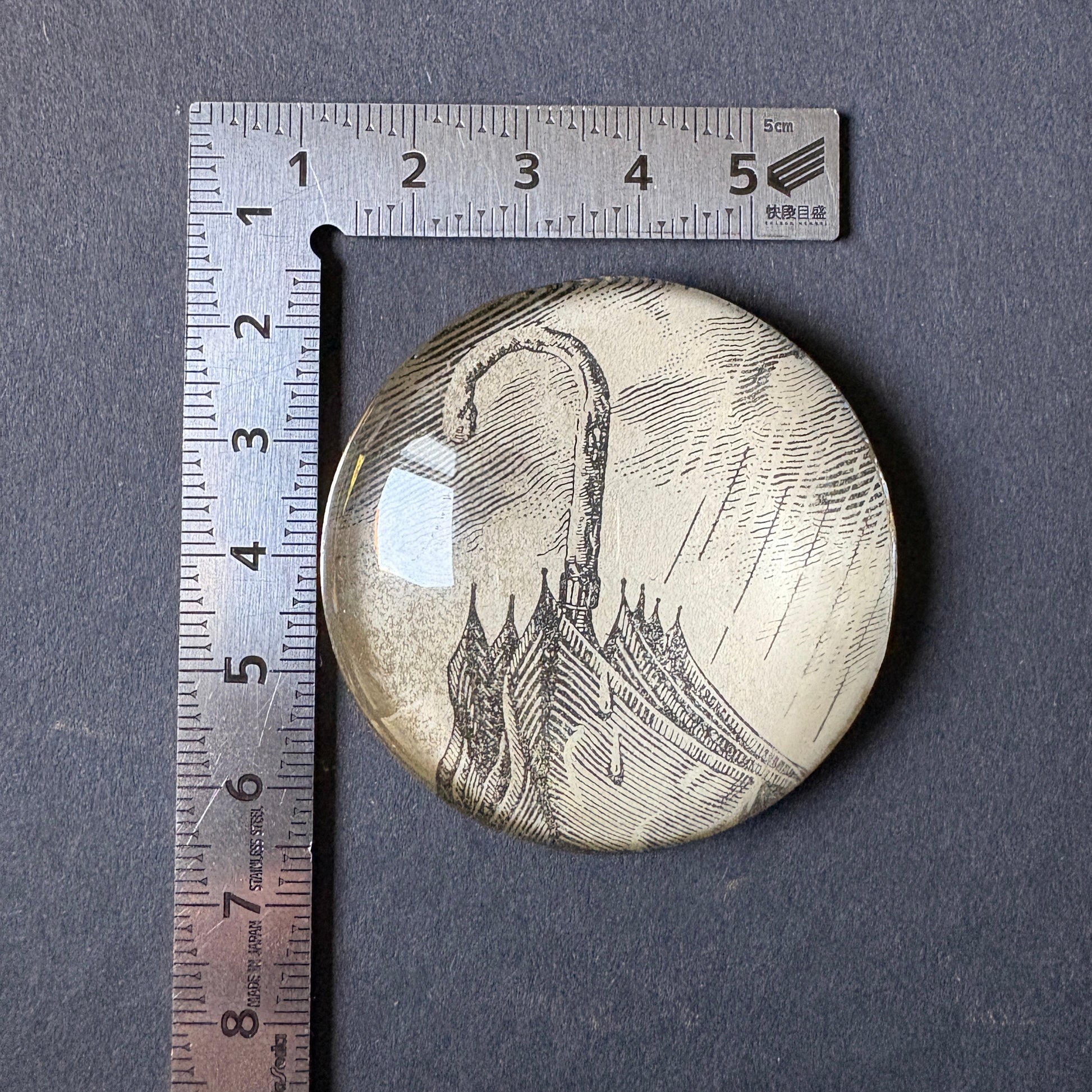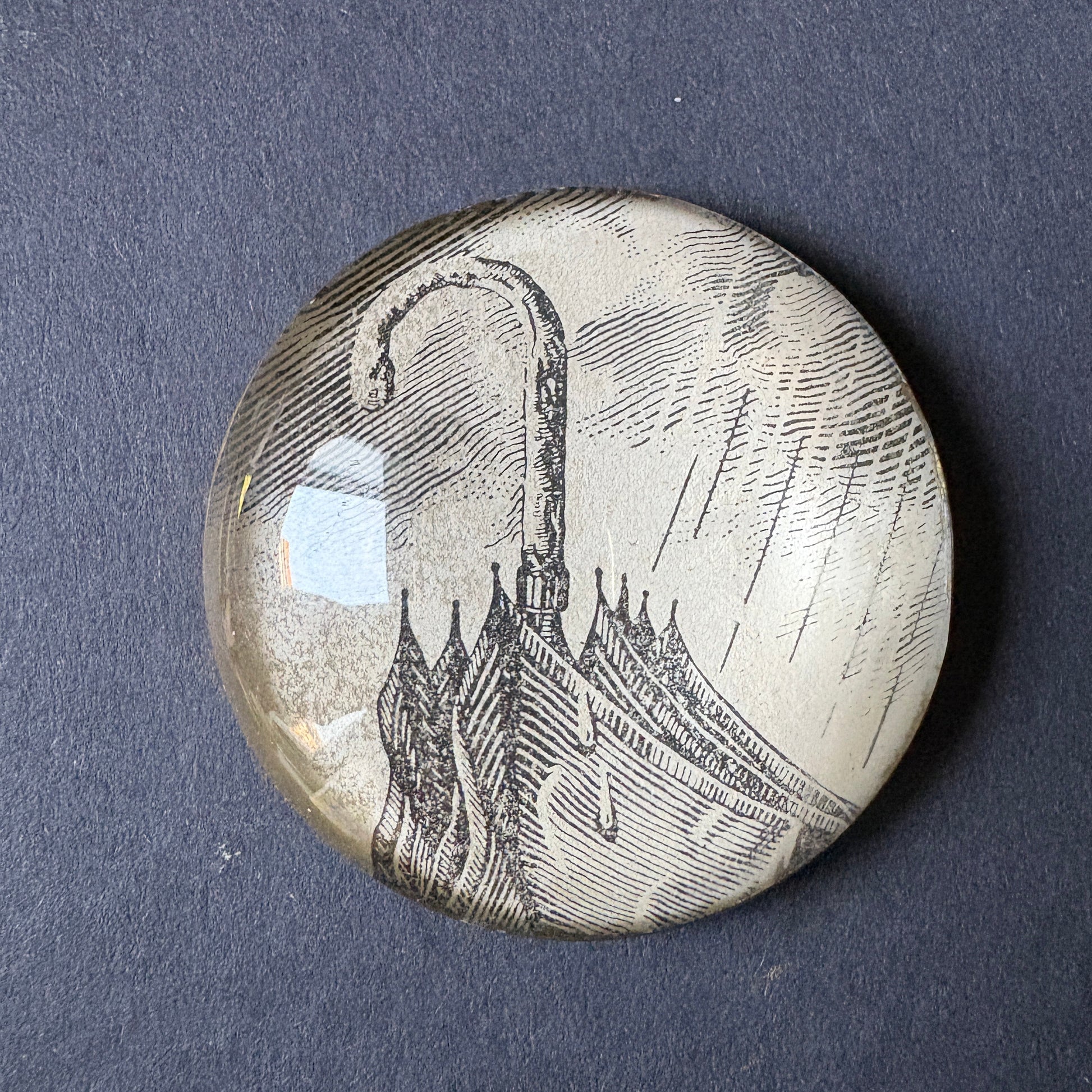 • Pezzo unico • Illustrazione originale del 1951 • Dimensioni: 5 cm di diametro • Base in velluto nero • Lente in vetro