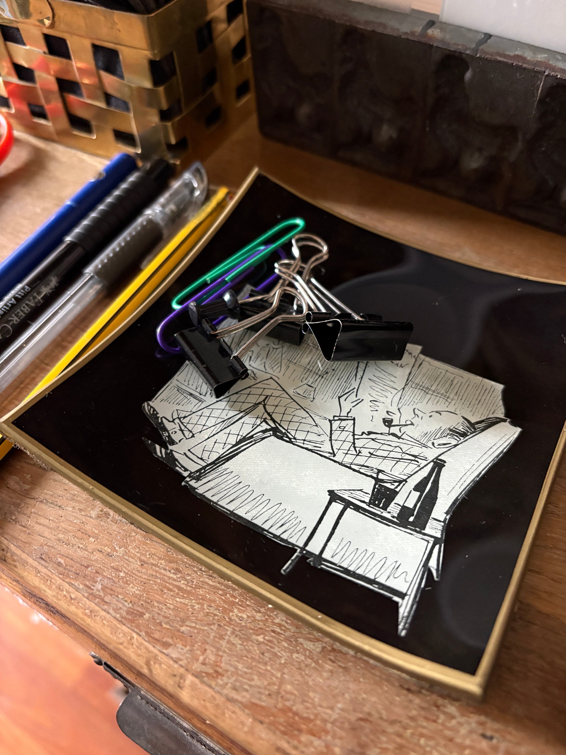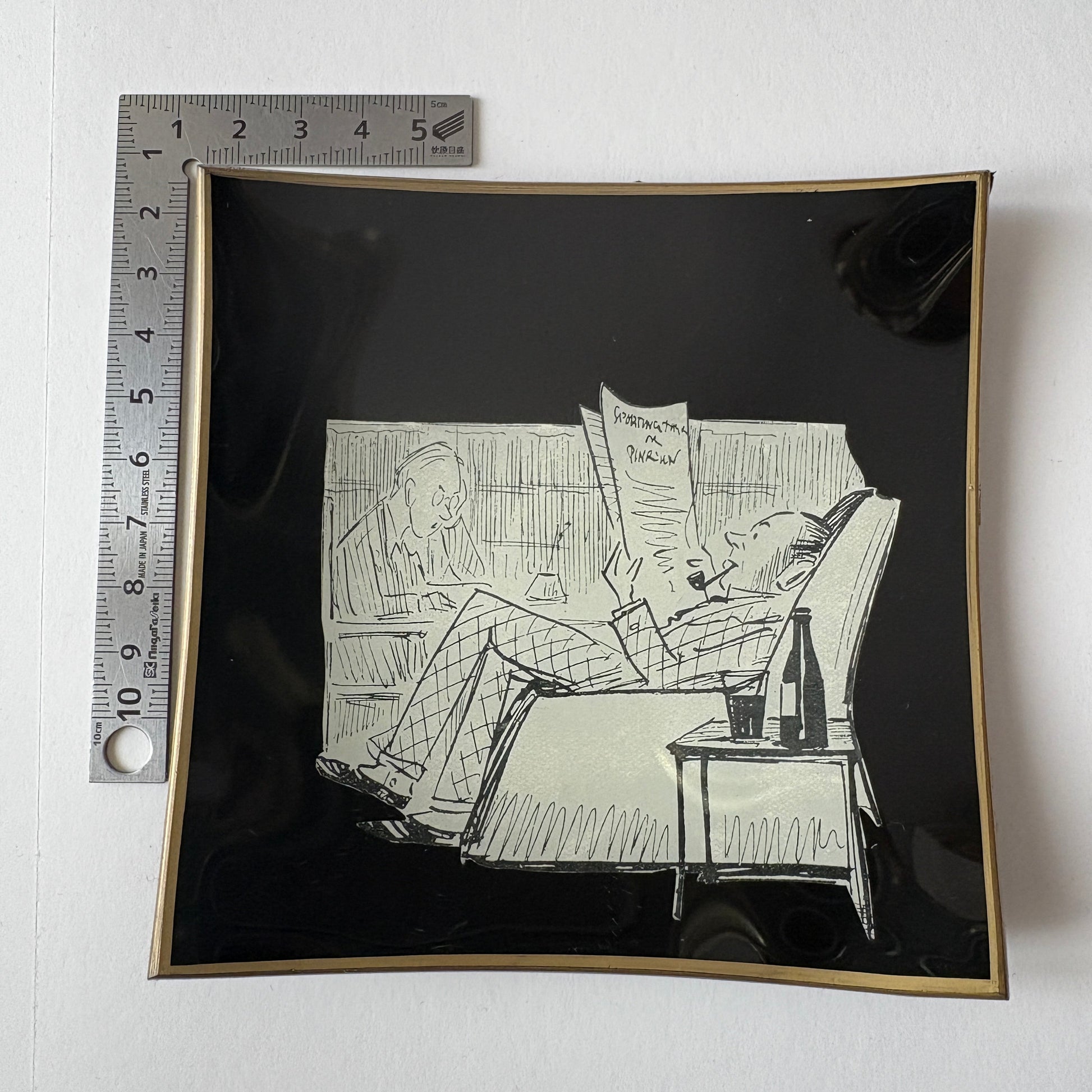 Pezzo unico ricavato dalla prima edizione del 1928 di "Further Forensic Fables", raccolta di vignette umoristiche dedicate al mondo legale. Questo shelfie/svuotatasche presenta un ritaglio originale delle illustrazioni londinesi, montato su base in velluto nero. Dimensioni: 11,5x11,5cm. Manutenzione semplice: passare delicatamente con panno umido. Un oggetto di rara unicità per collezionisti di stampe vintage e appassionati di satira grafica.