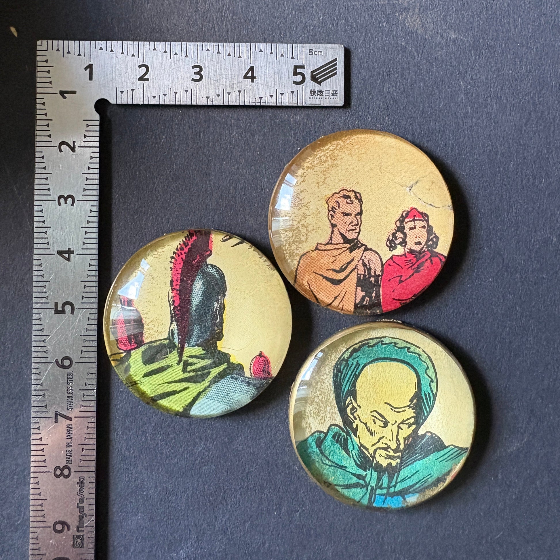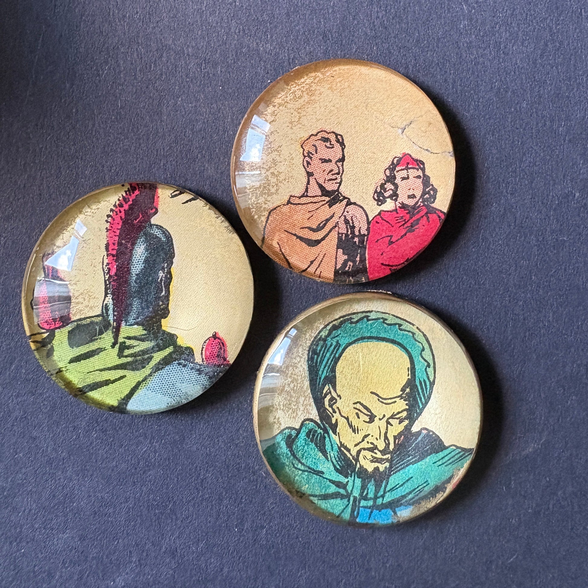 Tre piccole lenti che custodiscono ritagli originali tratti da un fumetto di Gordon del 1957 e 1961